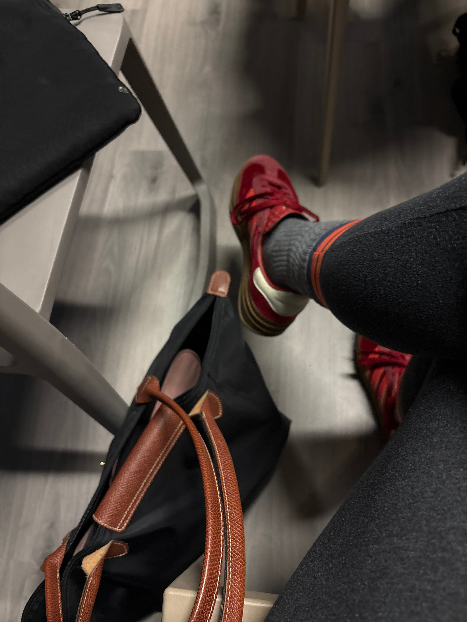 The image shows a seated person wearing gray leggings, gray socks with orange stripes, and red sneakers. A black tote bag with brown leather handles sits on the chair next to them. A black zippered po…read more