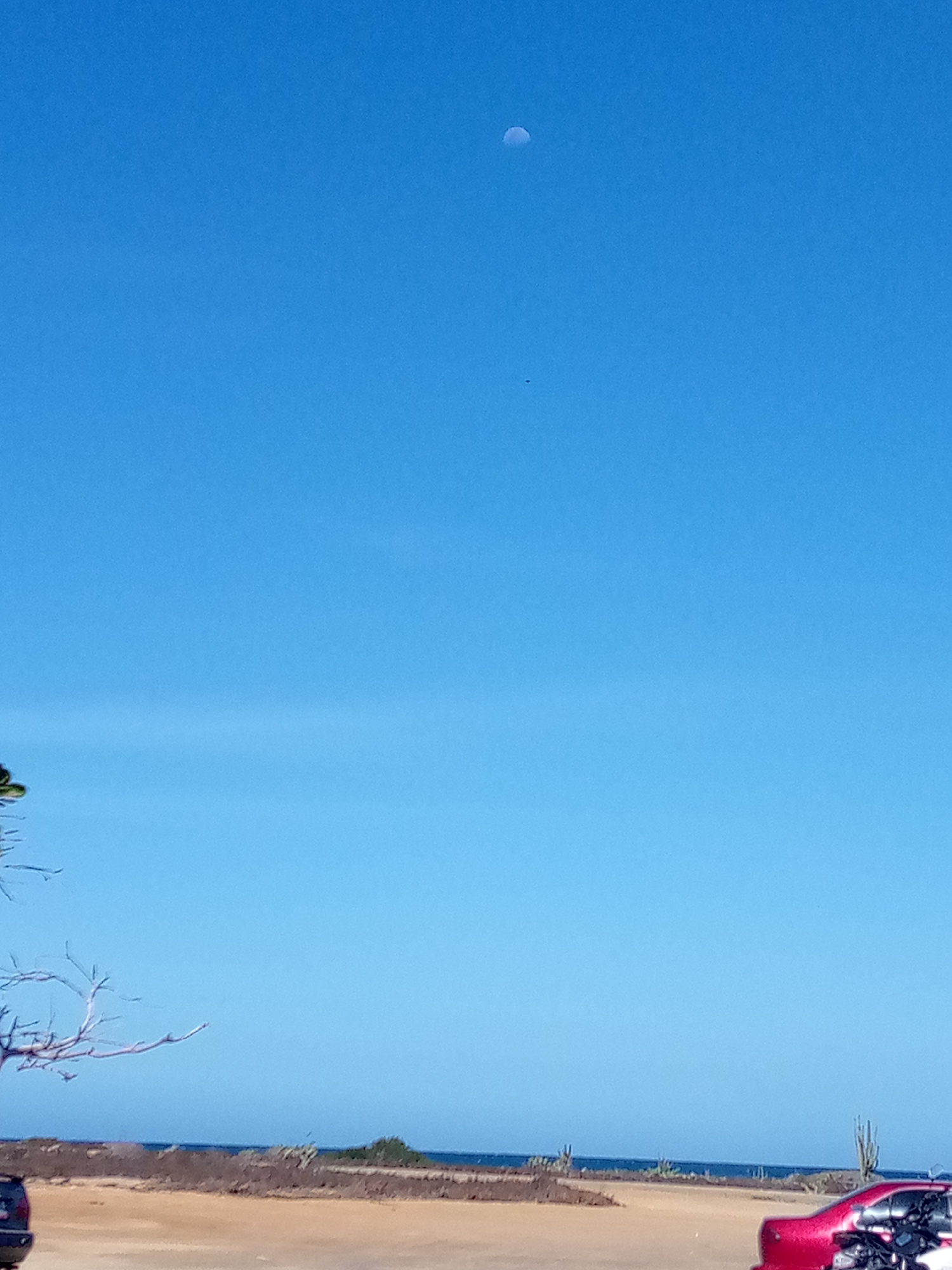 This image displays an arid coastal landscape in Porlamar, Venezuela, under a clear, bright blue sky. A distinct crescent moon is visible in the upper-left quadrant of the sky. Below and to the right…read more