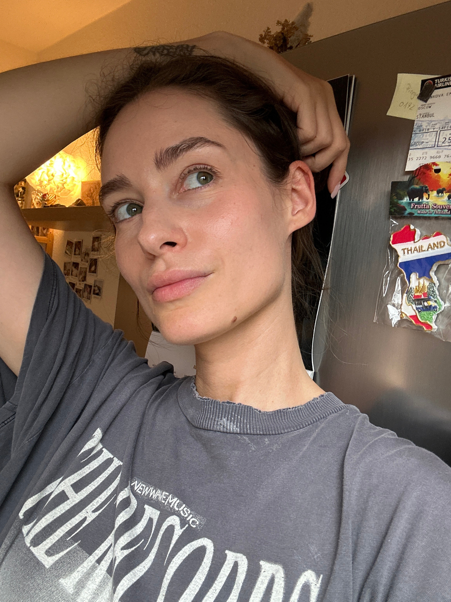 The image is a selfie of a fair-skinned woman with light green eyes and brown hair. She is wearing a grey t-shirt with white lettering that includes the word "NEWWAVEMUSIC." Her left arm is raised wit…read more