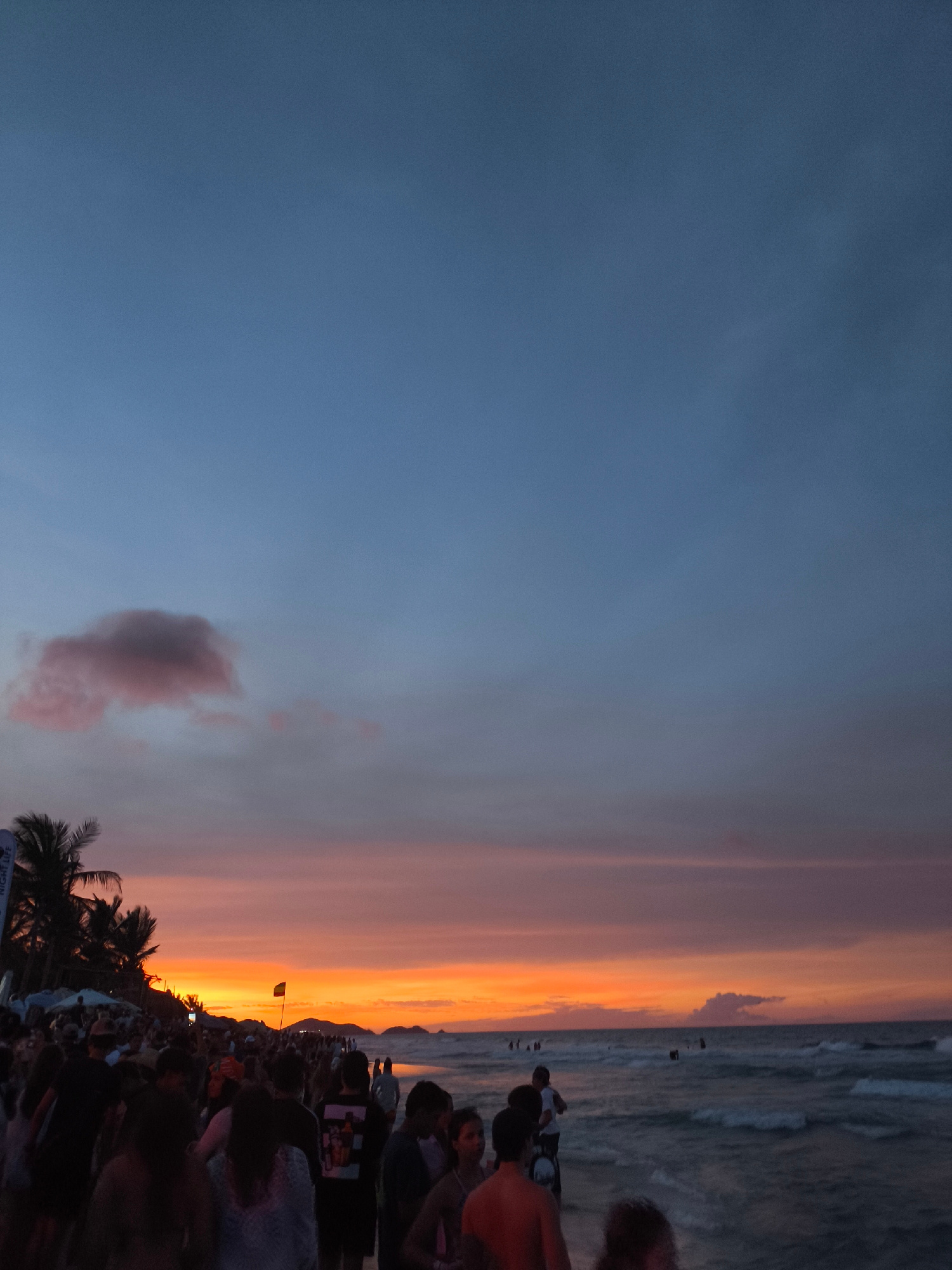 The image shows a crowded beach scene at Playa Parguito, Venezuela during sunset. The sky transitions from blue at the top to orange and pink near the horizon. Silhouetted palm trees are visible on th…read more