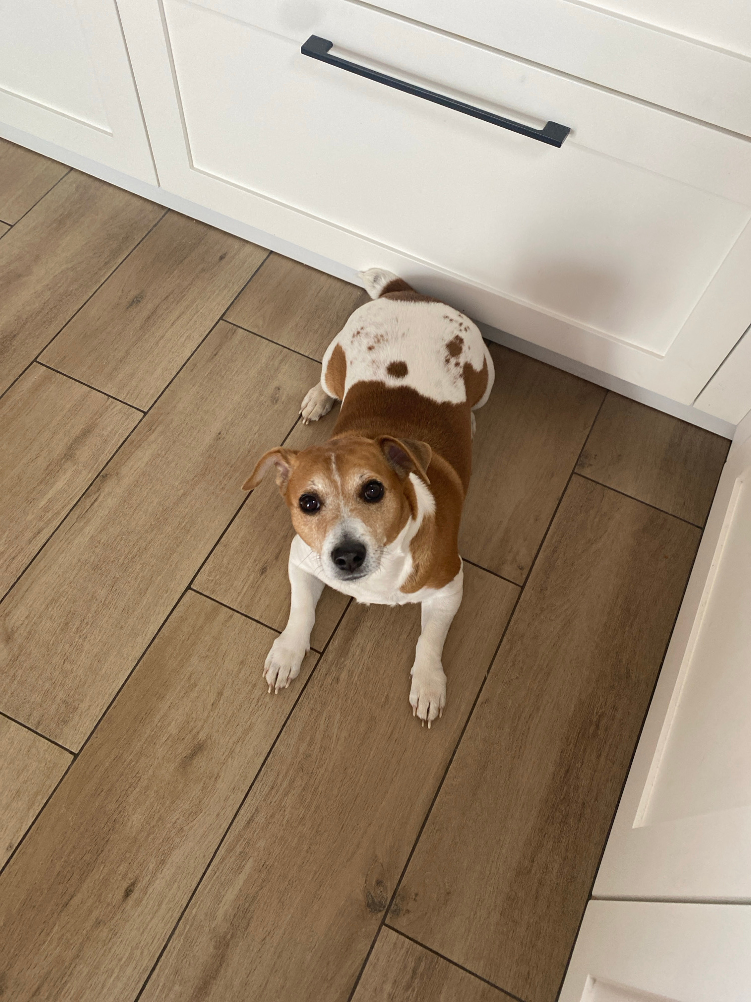 A Jack Russell Terrier dog with white and brown markings lies on a wood-look tile floor next to white kitchen cabinets with a black handle. The dog is looking directly at the camera. The location is i…read more