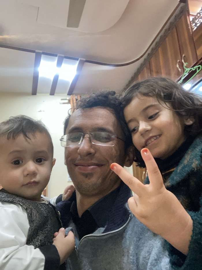 A rotated selfie features a man with glasses, a young girl, and a toddler. The girl, positioned above the man, smiles and holds up a peace sign. The man looks directly at the camera with a slight smil…read more