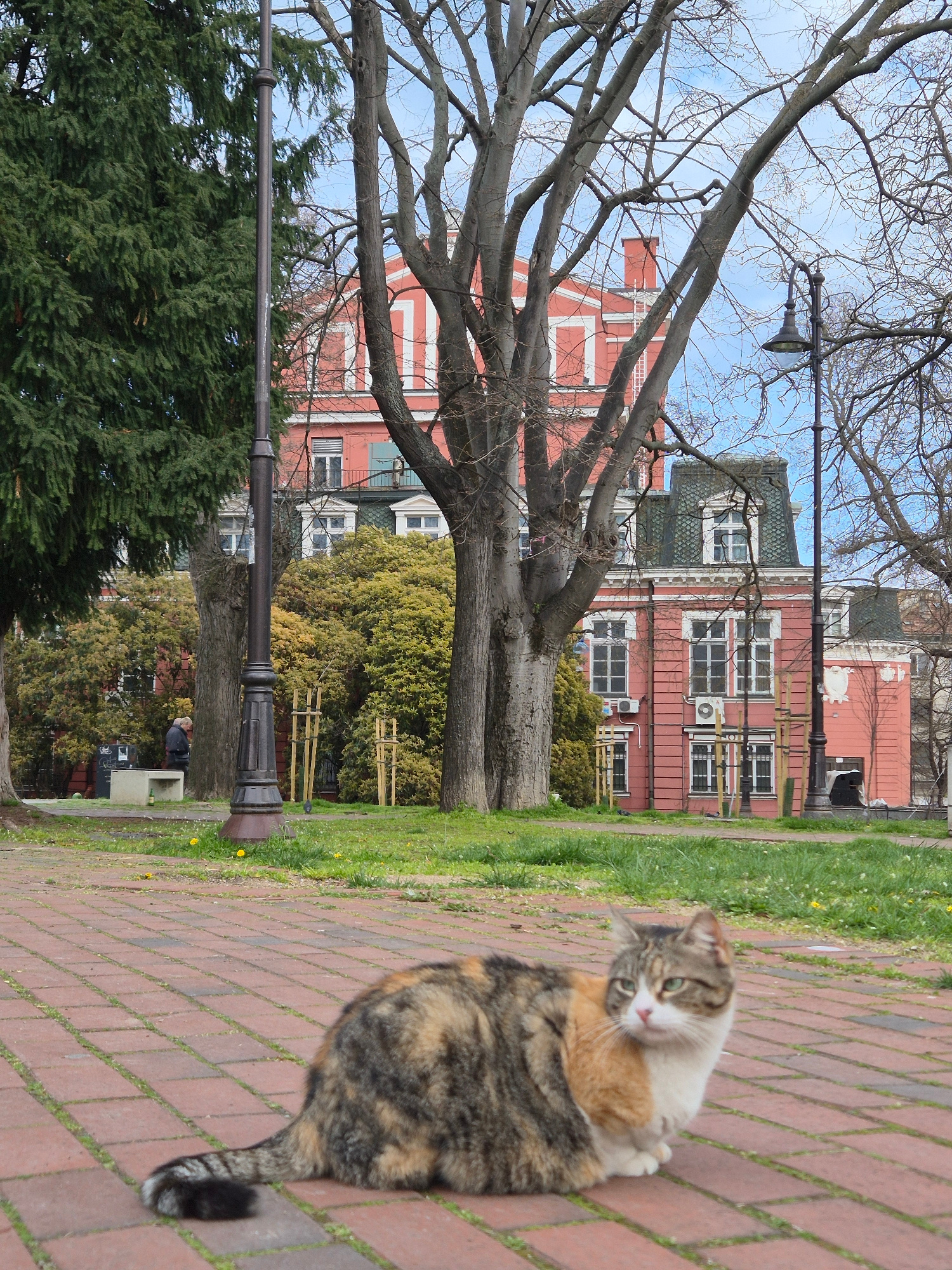 A tortoiseshell cat lies on a brick path in a park in Varna, Bulgaria. The park contains trees and grass. Buildings are visible in the background, and a person sits on a park bench. Streetlights are v…read more