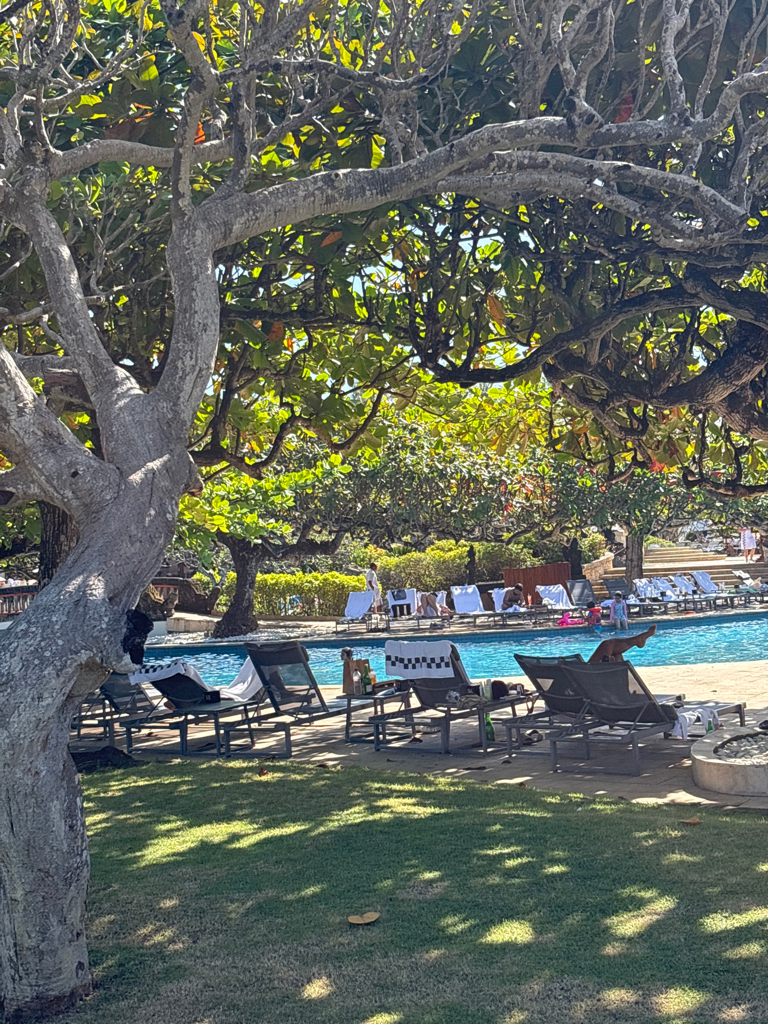 The image captures a scene at an outdoor pool area in Kuta Selatan, Indonesia. The foreground is dominated by a large, sprawling tree with gnarled branches and green leaves. The pool is lined with lou…read more