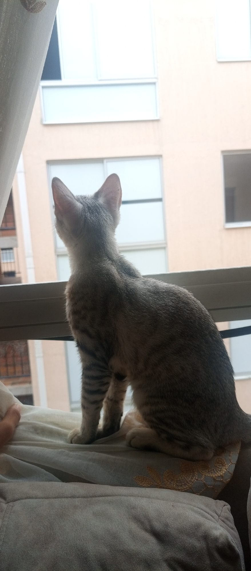 A domestic cat, exhibiting a grey and brown tabby coat with prominent stripes, is seated facing away from the viewer, looking out a window at an external building in Perímetro Urbano Cúcuta, Colombia. The cat's back is presented to the camera, with its head and ears turned towards the outside environment. The cat rests on a light-colored, possibly cream or beige, patterned fabric, which itself appears to be a cushion or blanket. A human hand is partially visible on the lower left, resting on the fabric. Beyond the window, a multi-story building with a light peach/beige colored facade is visible, featuring multiple rectangular windows with white or silver frames. Some windows appear darkened, while others reflect ambient light. On the far left, a portion of another structure with a balcony is faintly visible. The scene is illuminated by ambient light from the exterior. | Open Wire