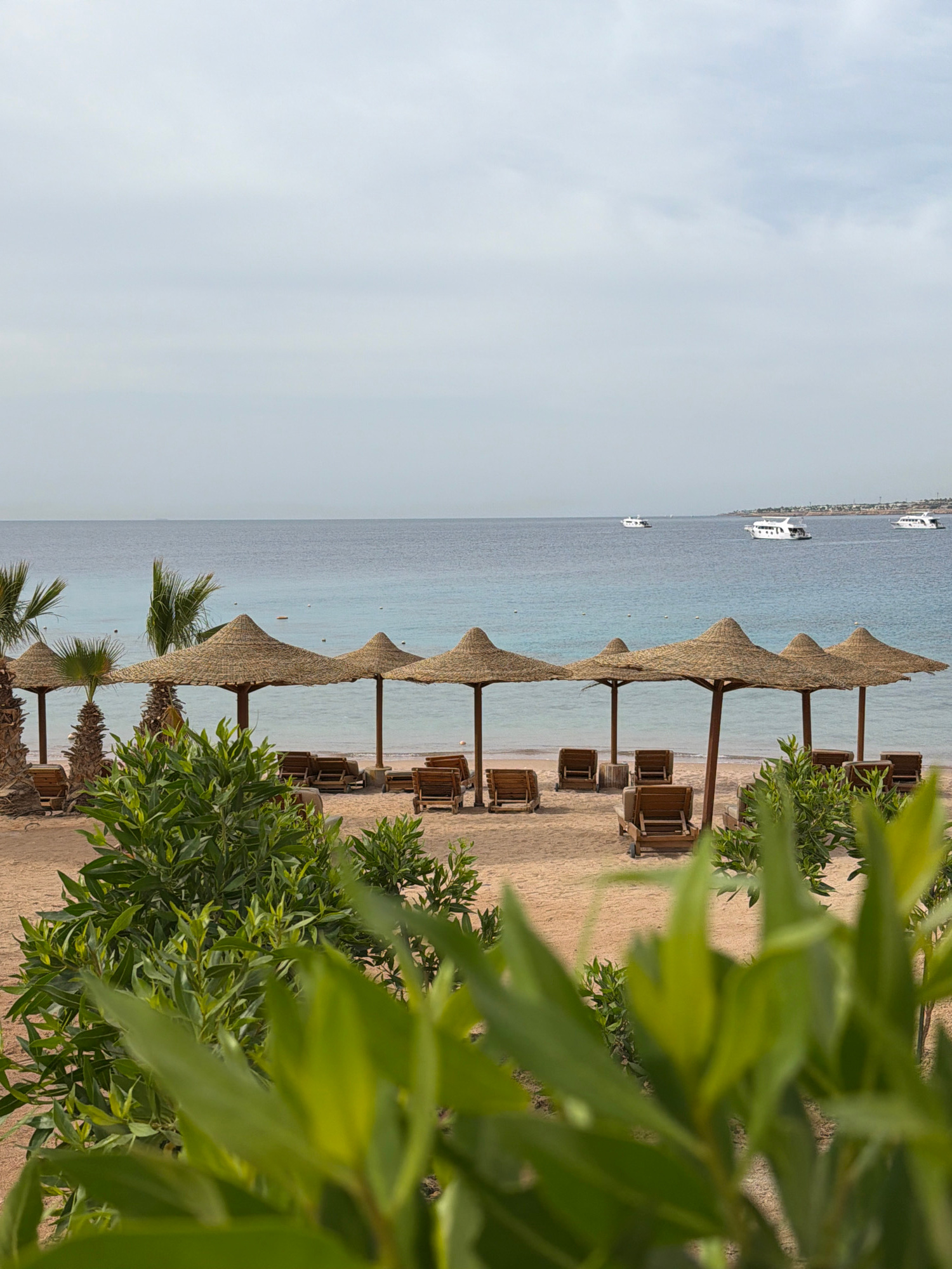 The image shows a beach scene in Sharm El Sheikh, Egypt. The foreground includes lush green vegetation partially obscuring the view. Moving towards the center, there are rows of straw-thatched umbrell…read more