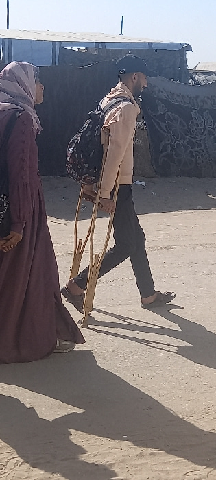 The image shows two individuals walking on sandy ground under bright daylight in Khan Yunis, Palestinian Territory. On the left, a female wears a maroon abaya and a matching hijab, her face in profile…read more