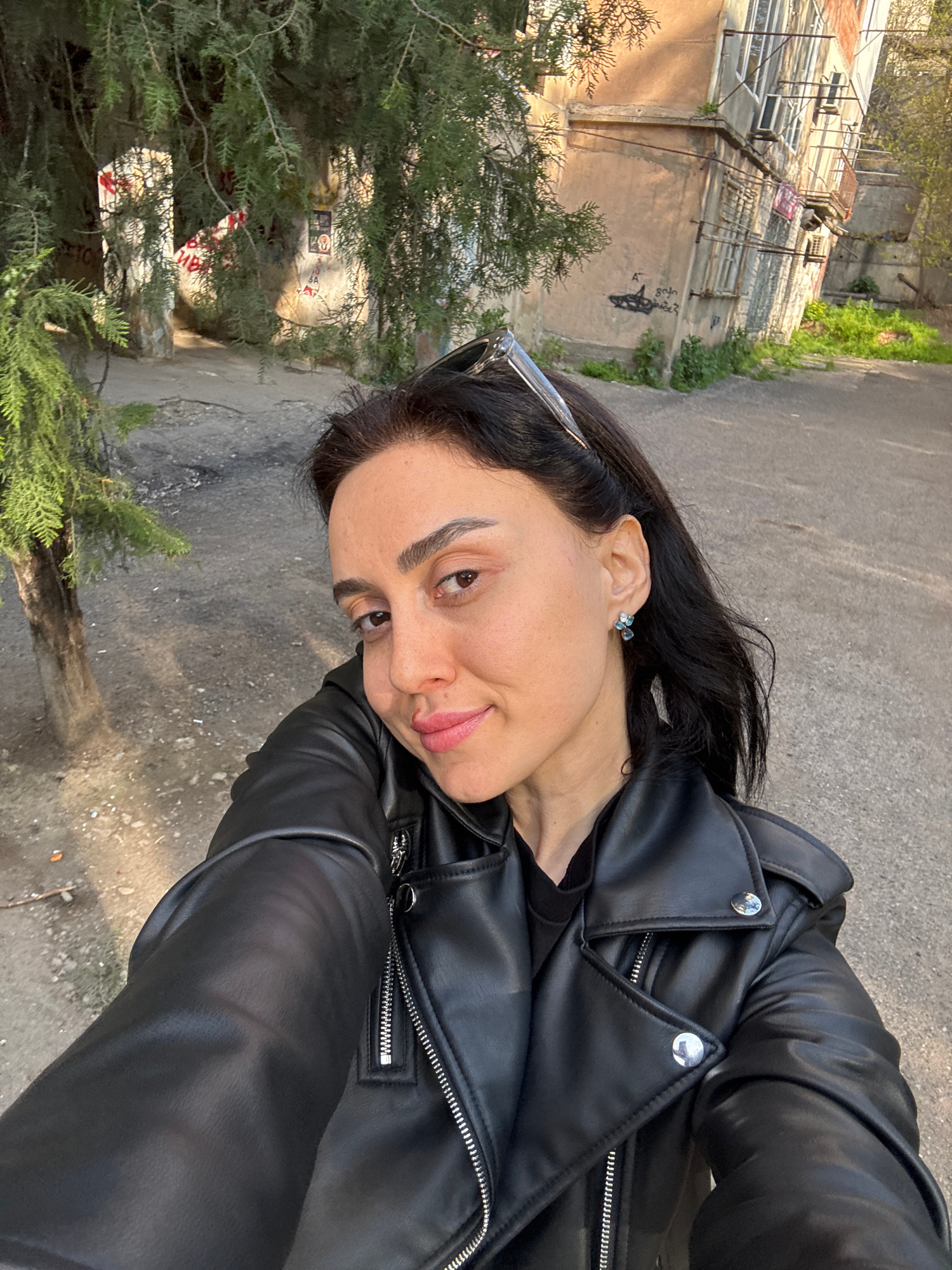 A woman with dark hair and eyebrows, wearing a black leather jacket and small blue earrings, is centered in the image. Sunglasses are perched on her head. She is facing the camera. The background reve…read more