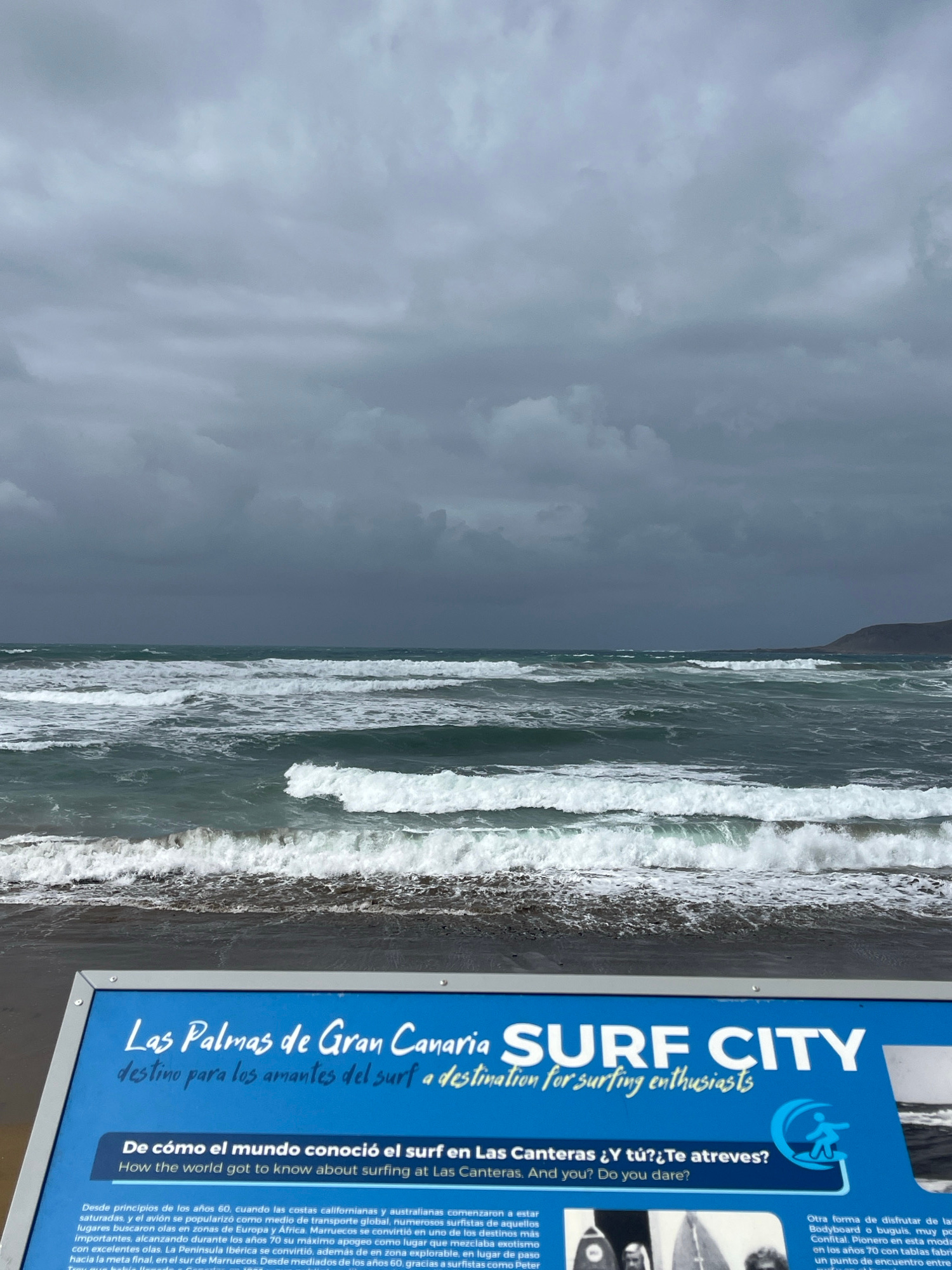 Here is a description of the image: The image shows a dark and moody coastal scene. On the right, a blue and white information board is visible, labeled "Las Palmas de Gran Canaria SURF CITY" and desβ¦read more