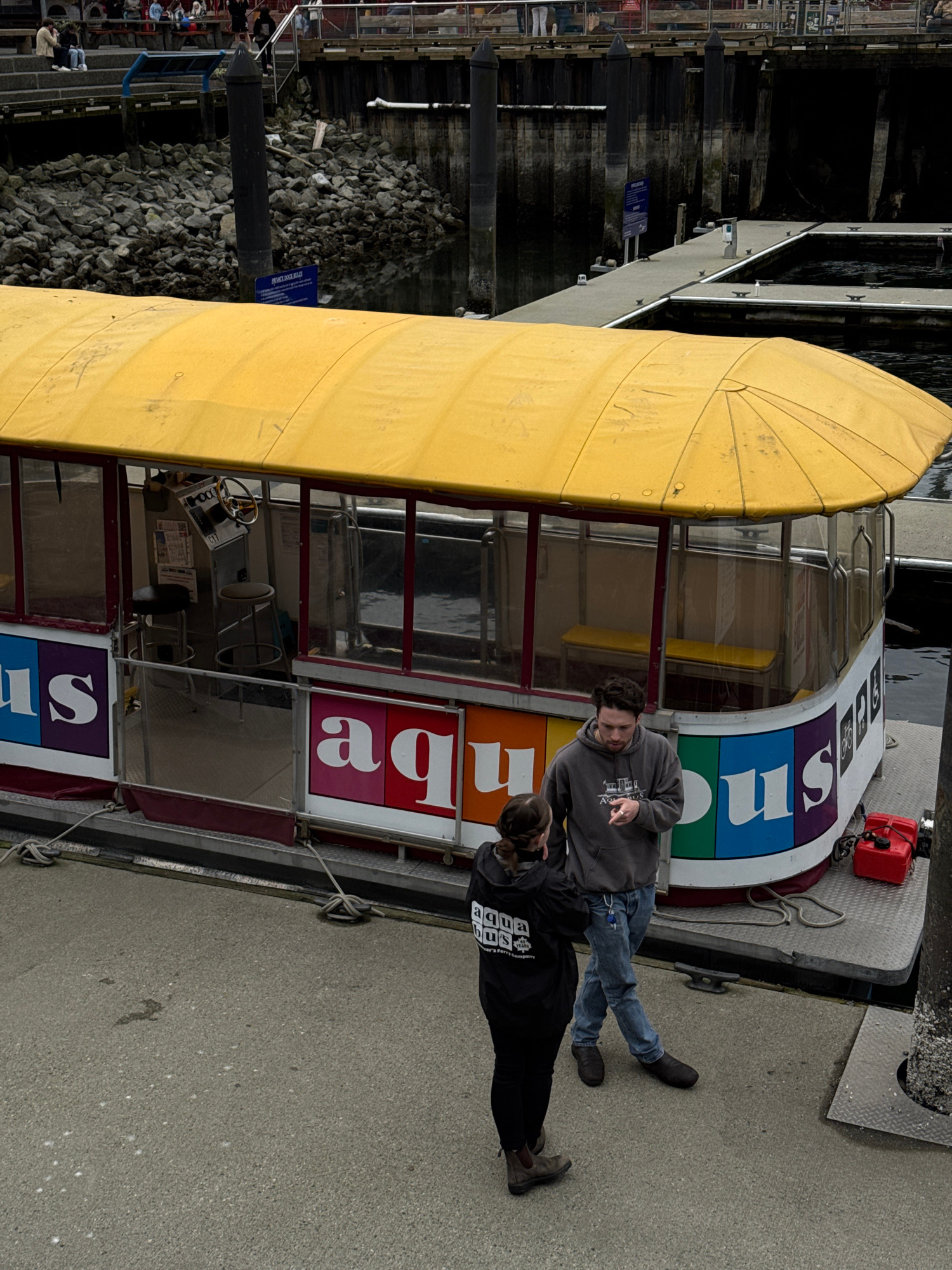 Here is a description of the image: **Scene:** A photograph taken at Granville Island in Vancouver, Canada, depicts a partially visible Aquabus ferry docked alongside a concrete walkway. The vessel f…read more