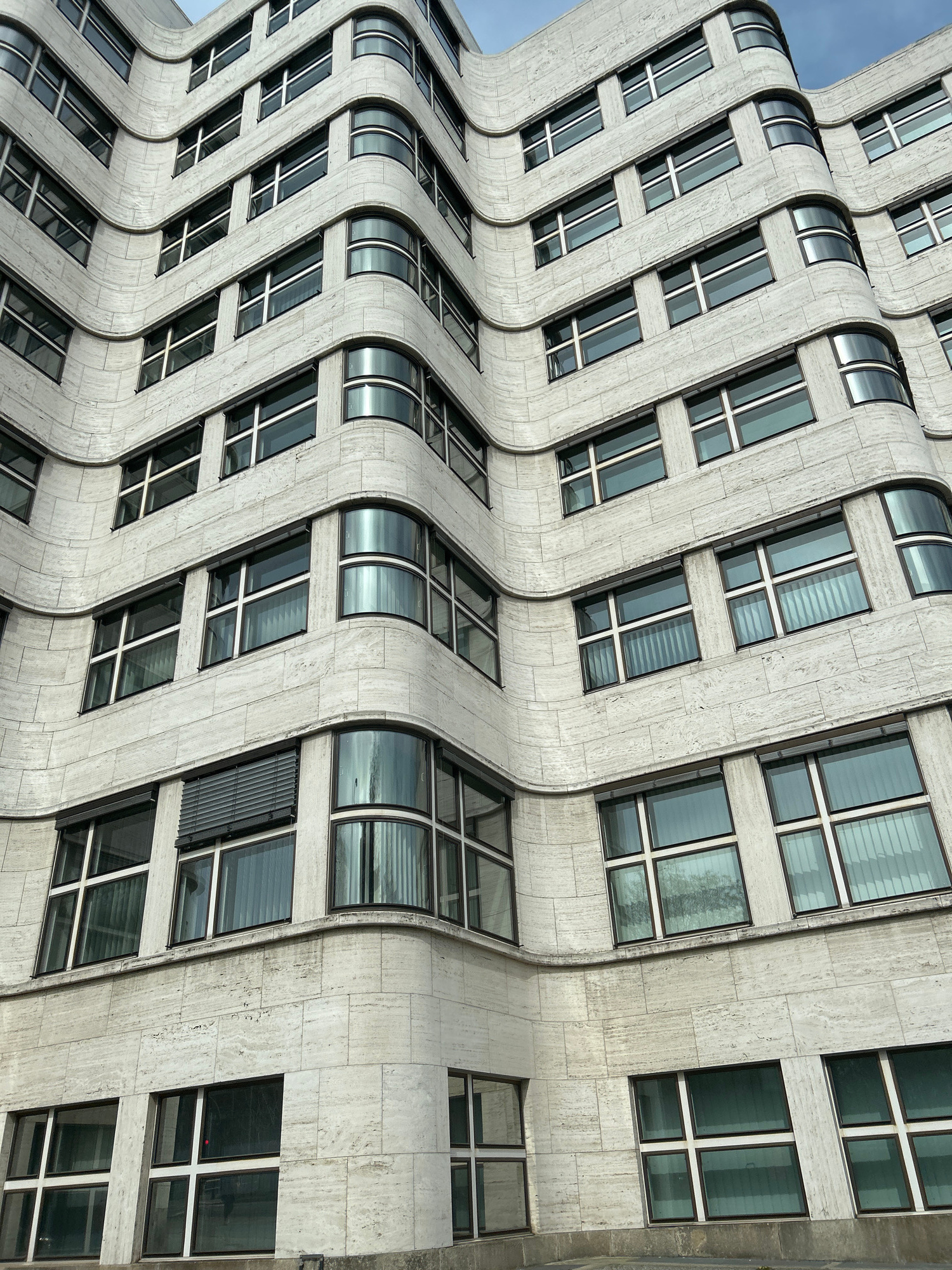 The image shows a section of the undulating facade of the Neuer Zollhof building in Düsseldorf, Germany. The architectural feature is characterized by curved, white-grey stone elements and rectangular…read more