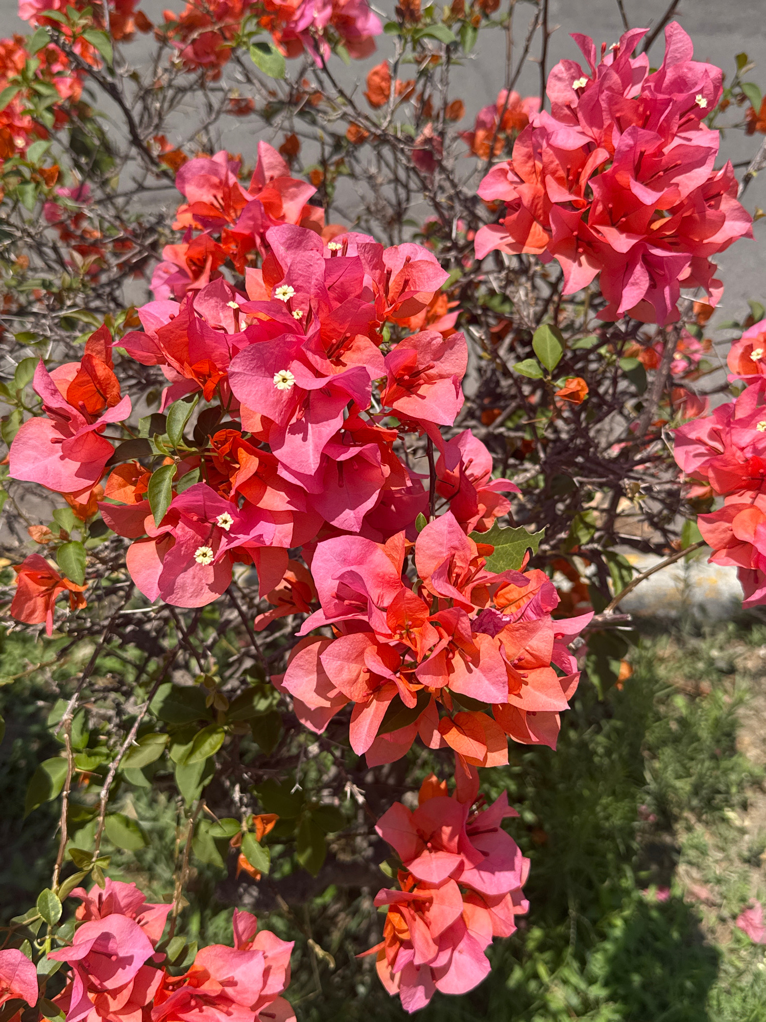 The image captures a close-up view of a vibrant bougainvillea plant in full bloom. The primary subjects are the numerous clusters of bright, papery bracts, which display a rich palette of salmon-pink,…read more