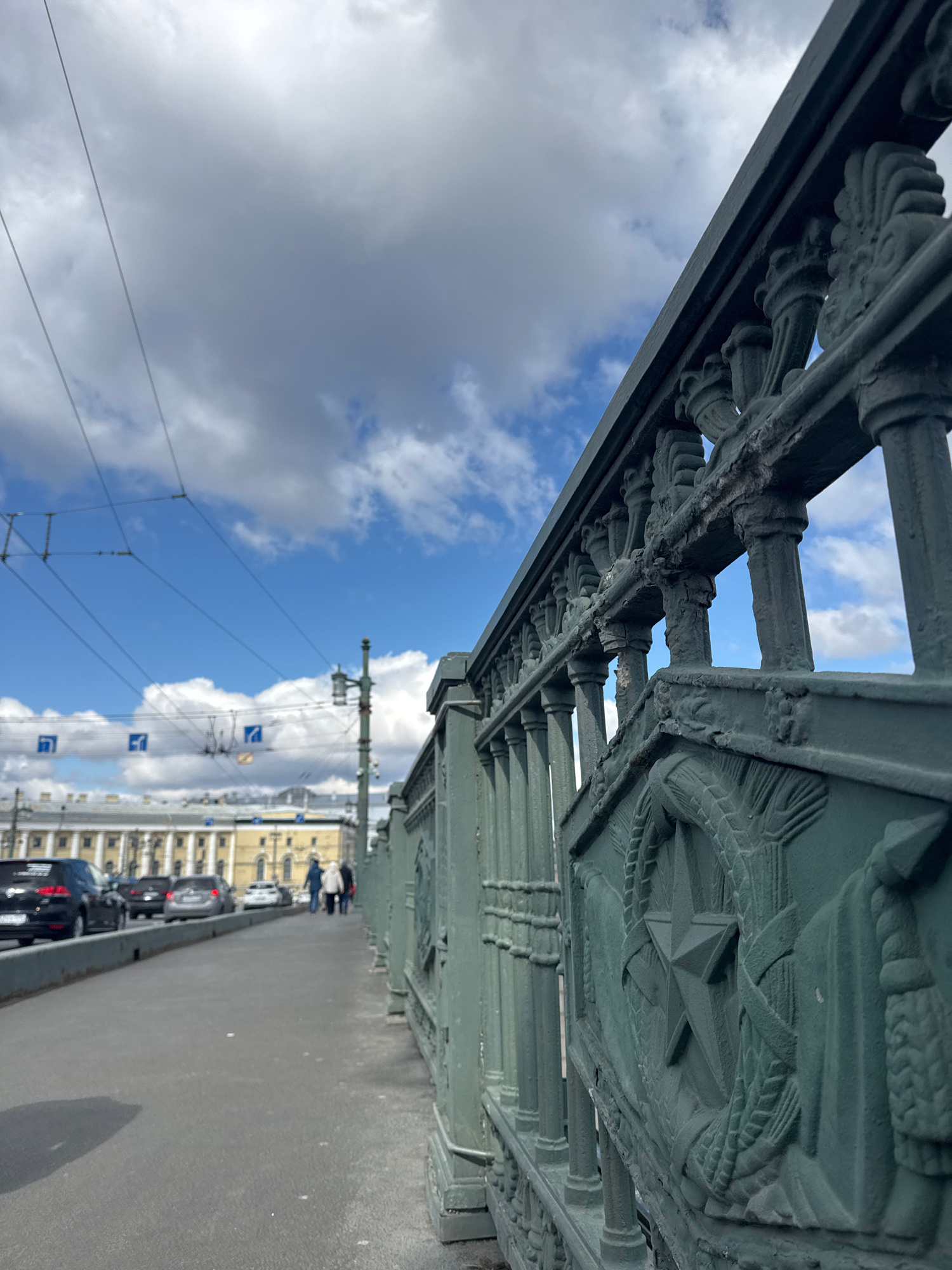The image shows a close-up view of a bridge railing in Saint Petersburg, Russia, with the cityscape visible in the background. The railing is painted green and features ornate detailing, including a p…read more