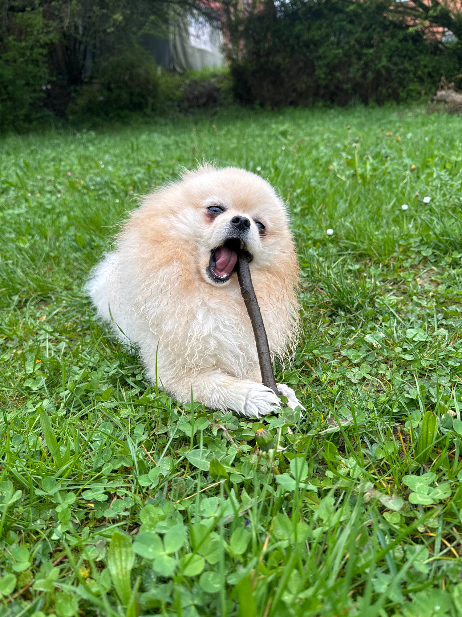 A light-furred Pomeranian dog is lying on its back in a grassy area, holding a dark brown stick in its mouth. The dog's mouth is open, and its teeth are visible. The grass appears to be a mix of grass…read more
