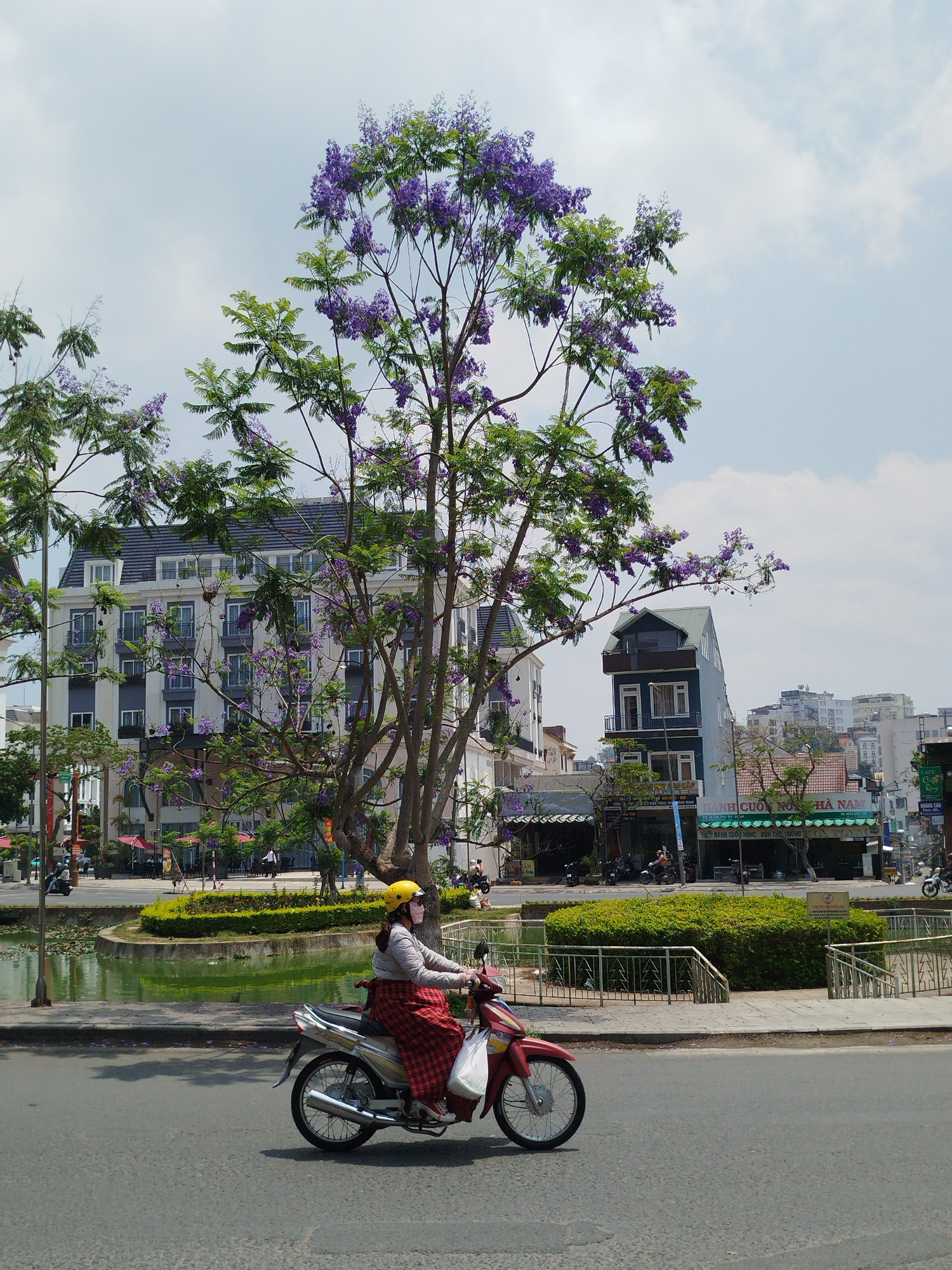 A medium shot depicts a woman riding a red motorcycle along a gray asphalt road. The rider is wearing a yellow helmet, a light-colored long-sleeved shirt, and a red and black plaid skirt. She also has…read more