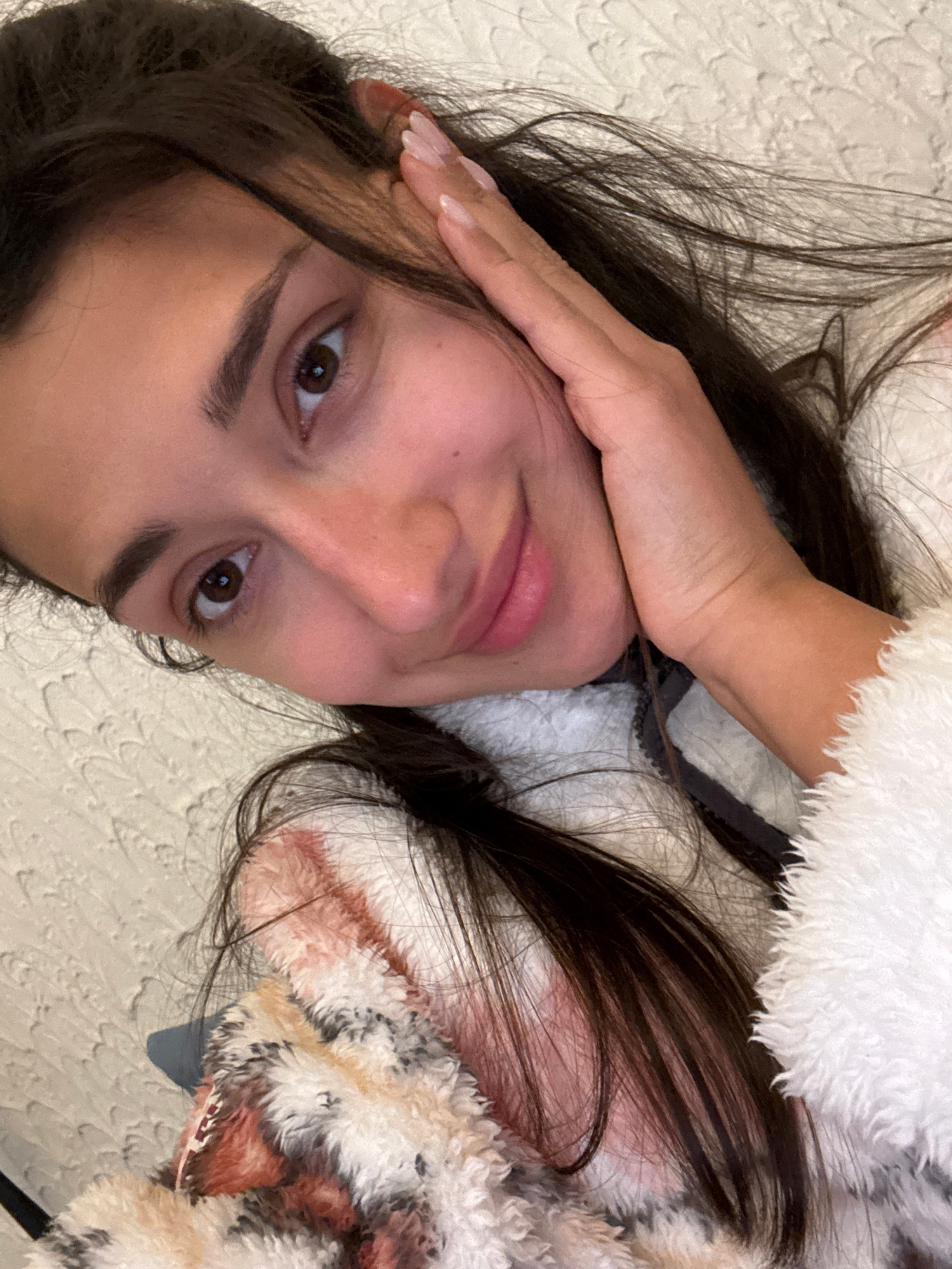 A close-up, angled image depicts a female individual, her head and upper torso positioned diagonally within the frame. She has long, dark brown hair, light brown eyes, and dark eyebrows, looking direc…read more