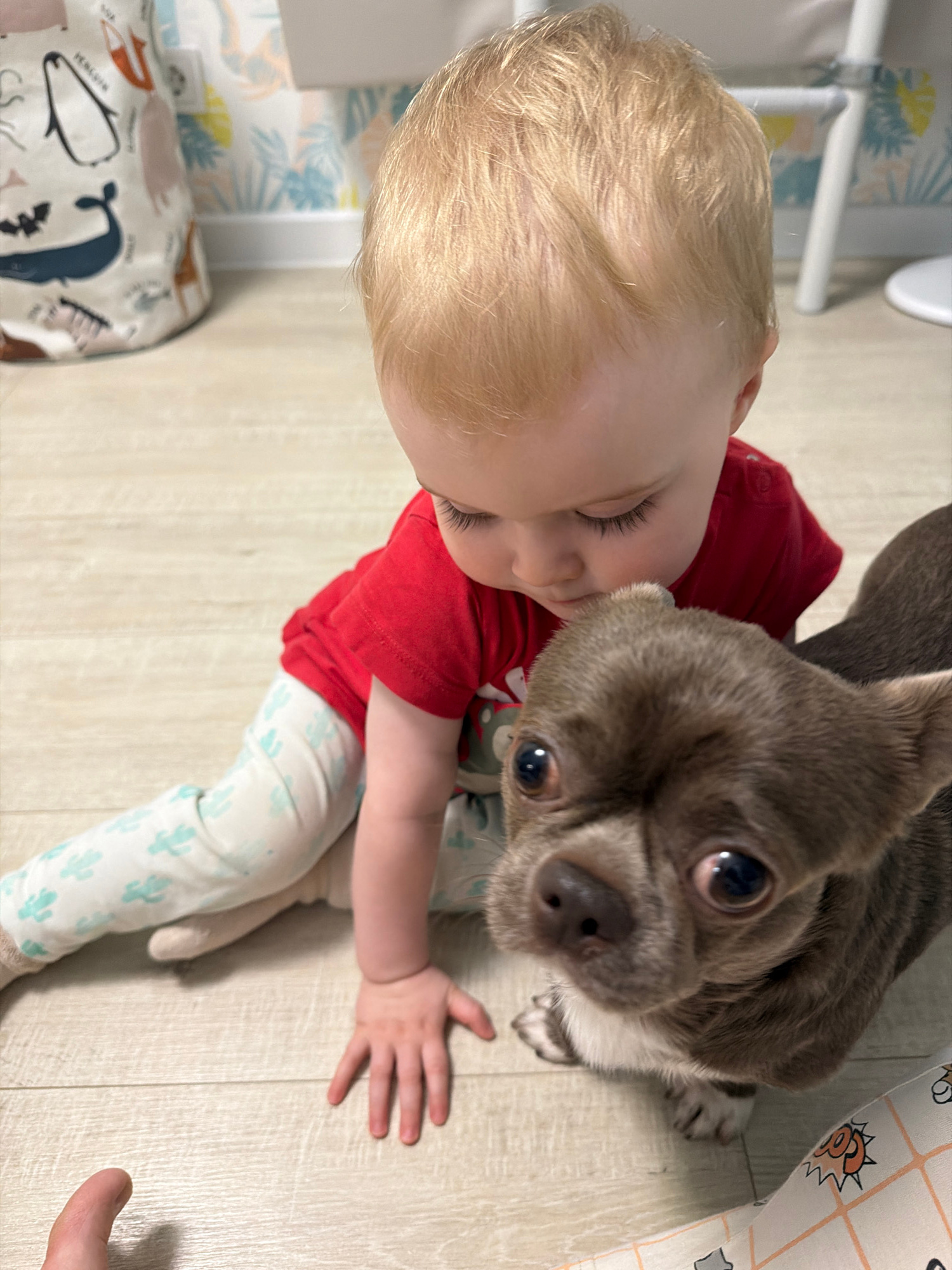 A top-down view captures a young child with blonde hair, wearing a red shirt and white leggings patterned with light blue cacti, positioned near a small, grey-brown dog with large, prominent eyes. Theβ¦read more