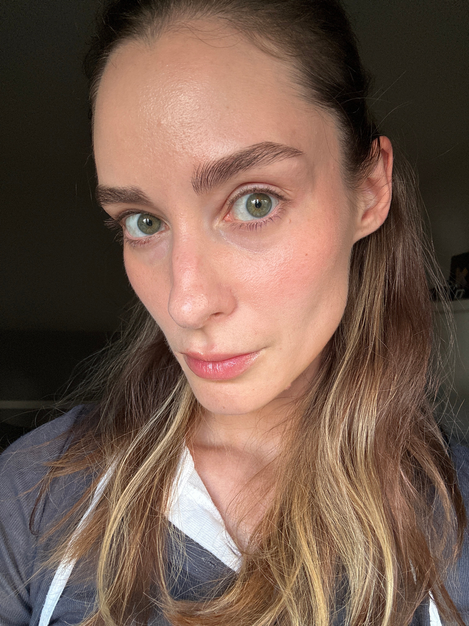 A selfie photograph shows a woman's face and upper torso. The woman has fair skin, green eyes, and brown hair with blonde highlights. She is wearing a gray shirt with a white collar visible. The backg…read more