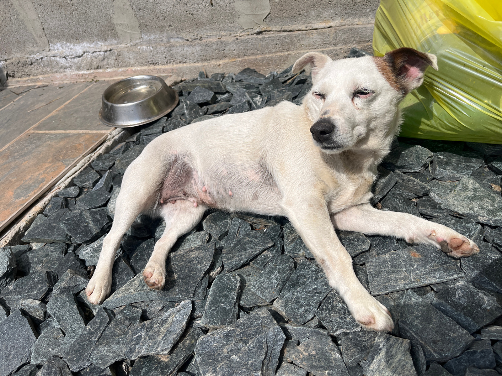 A white dog with brown markings on its ear lies on a pile of dark gray rocks. The dog is positioned in the center of the frame, its body angled slightly to the right. A metal bowl sits to the left of…read more