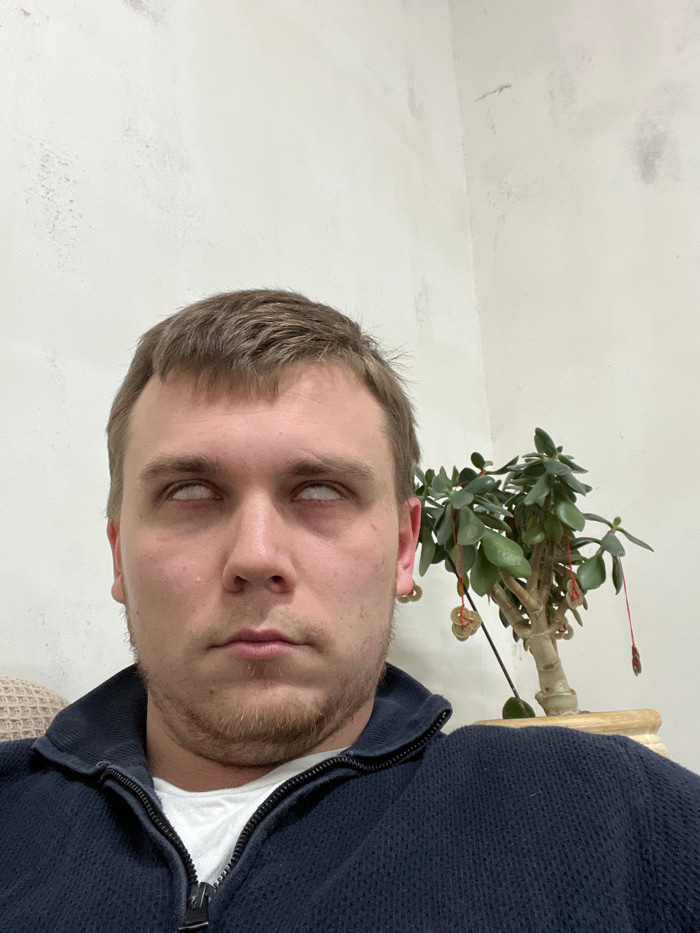 A man with light skin and short, light brown hair poses for a selfie. His eyes are rolled back, and he has a short beard. He wears a dark blue zip-up hoodie over a white shirt. In the upper right corn…read more