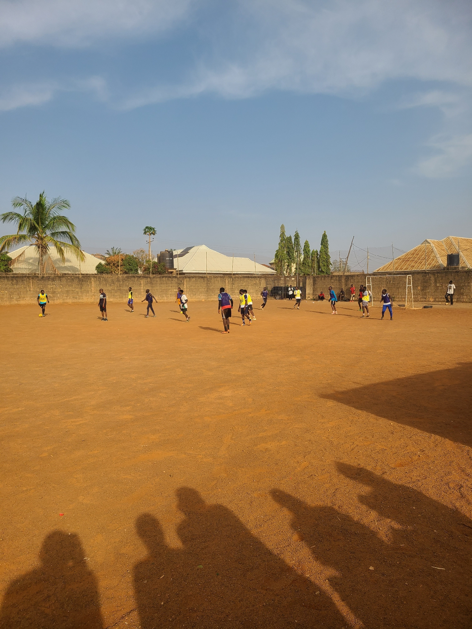 The image captures an outdoor sports training session taking place on a large, unpaved, reddish-brown earthen field. Under a clear, bright blue sky, numerous individuals, primarily children or young a…read more