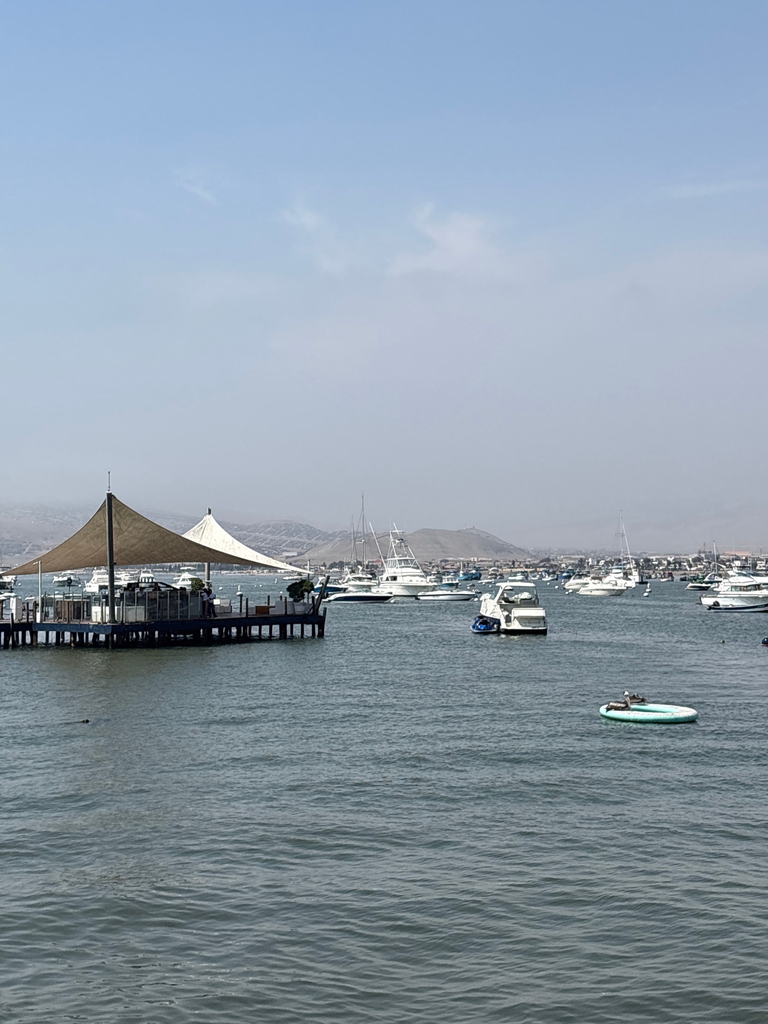 The photograph captures a waterfront scene in Ancón, Peru. The foreground features a pier adorned with two large, conical canvas canopies providing shade for a seating area. This pier is connected to…read more