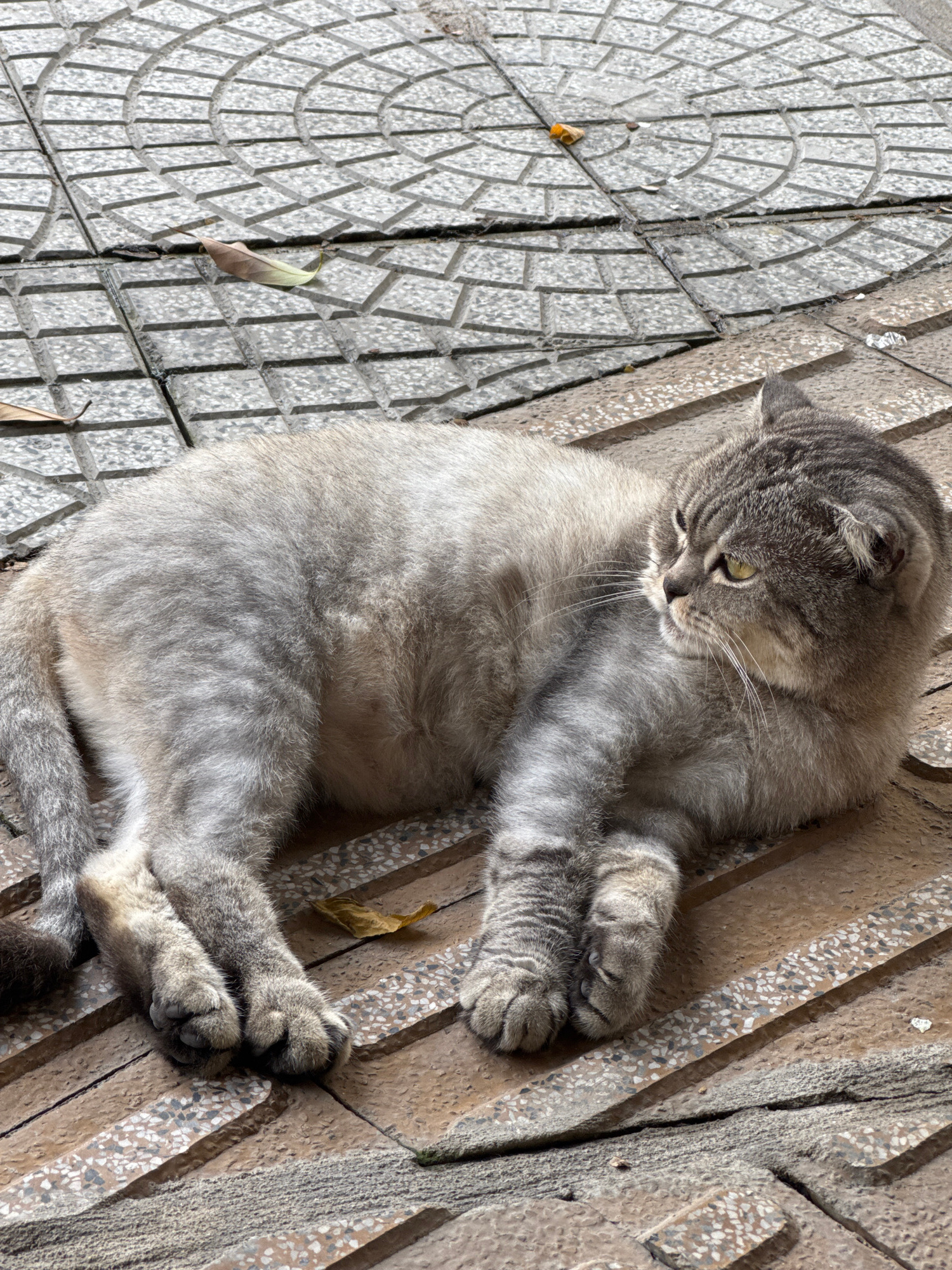 A gray tabby cat with yellow eyes lies on a textured outdoor surface composed of two distinct types of stone: one with a semi-circular geometric pattern and the other with long rectangular bars. The c…read more