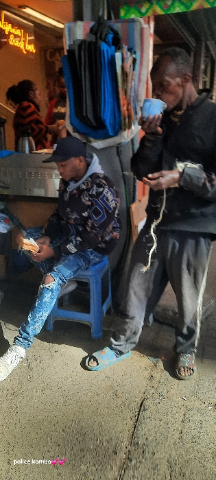 The image depicts a daytime street scene on a commercial thoroughfare in Nairobi, Kenya. In the foreground, two males are present. On the left, a younger male sits on a blue plastic stool, wearing a b…read more
