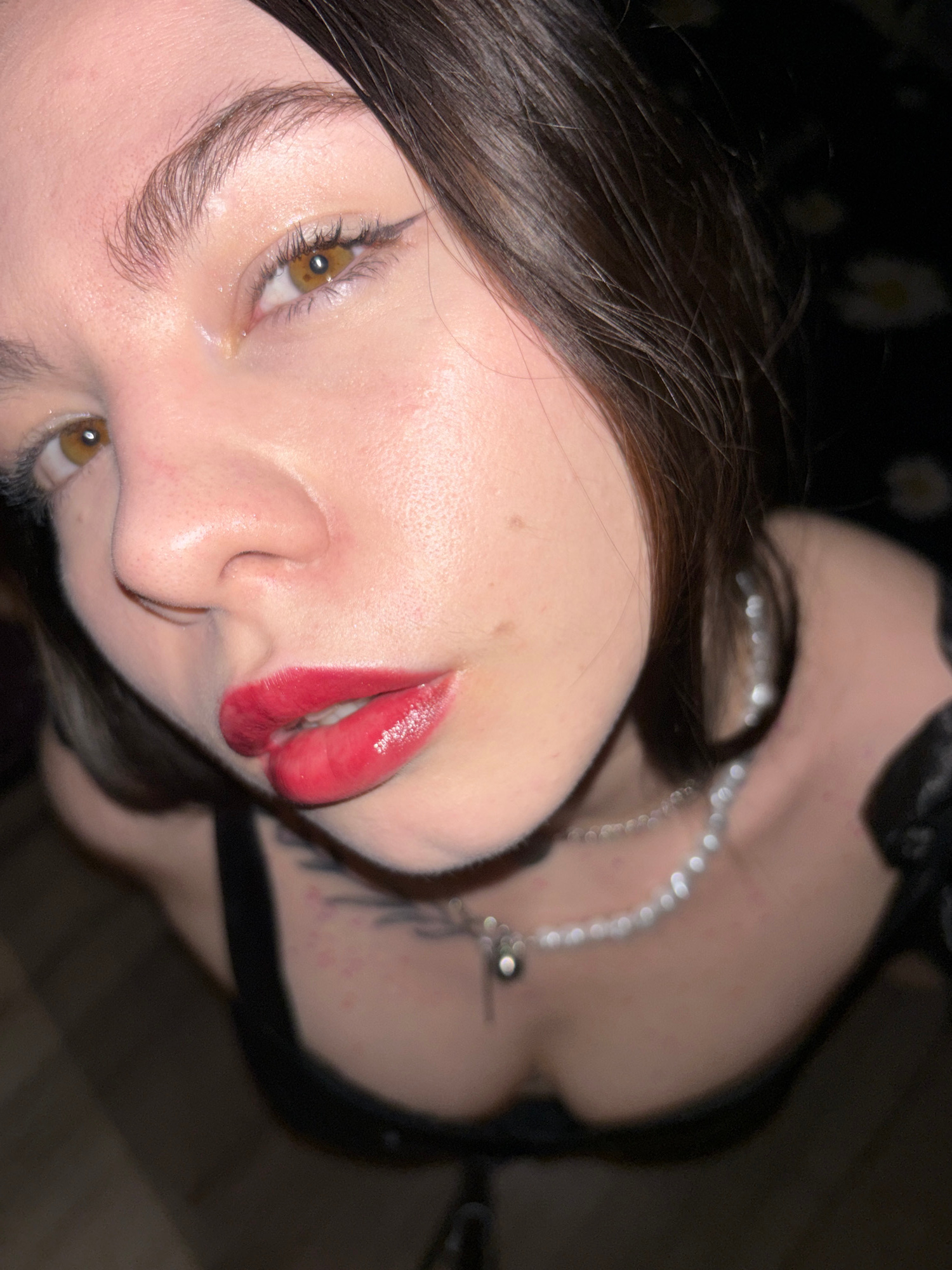 A close-up, tilted portrait of a young woman with fair skin and dark brown hair. Her eyes are hazel, and she wears dark eyeliner. Her lips are painted with glossy red lipstick. She has a silver chain…read more