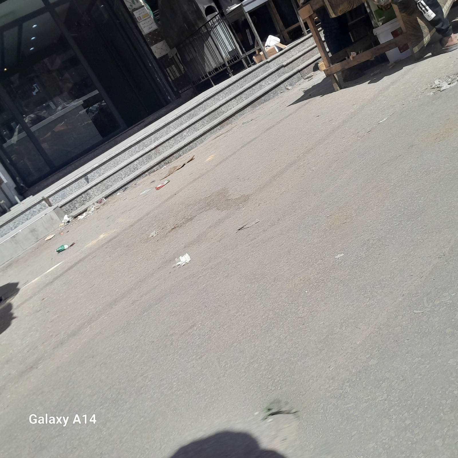 The image shows a street scene in Nuseirat, Palestinian Territory. The foreground is dominated by a gray asphalt surface, lightly littered with debris. A building with a glass storefront and a gray, v…read more
