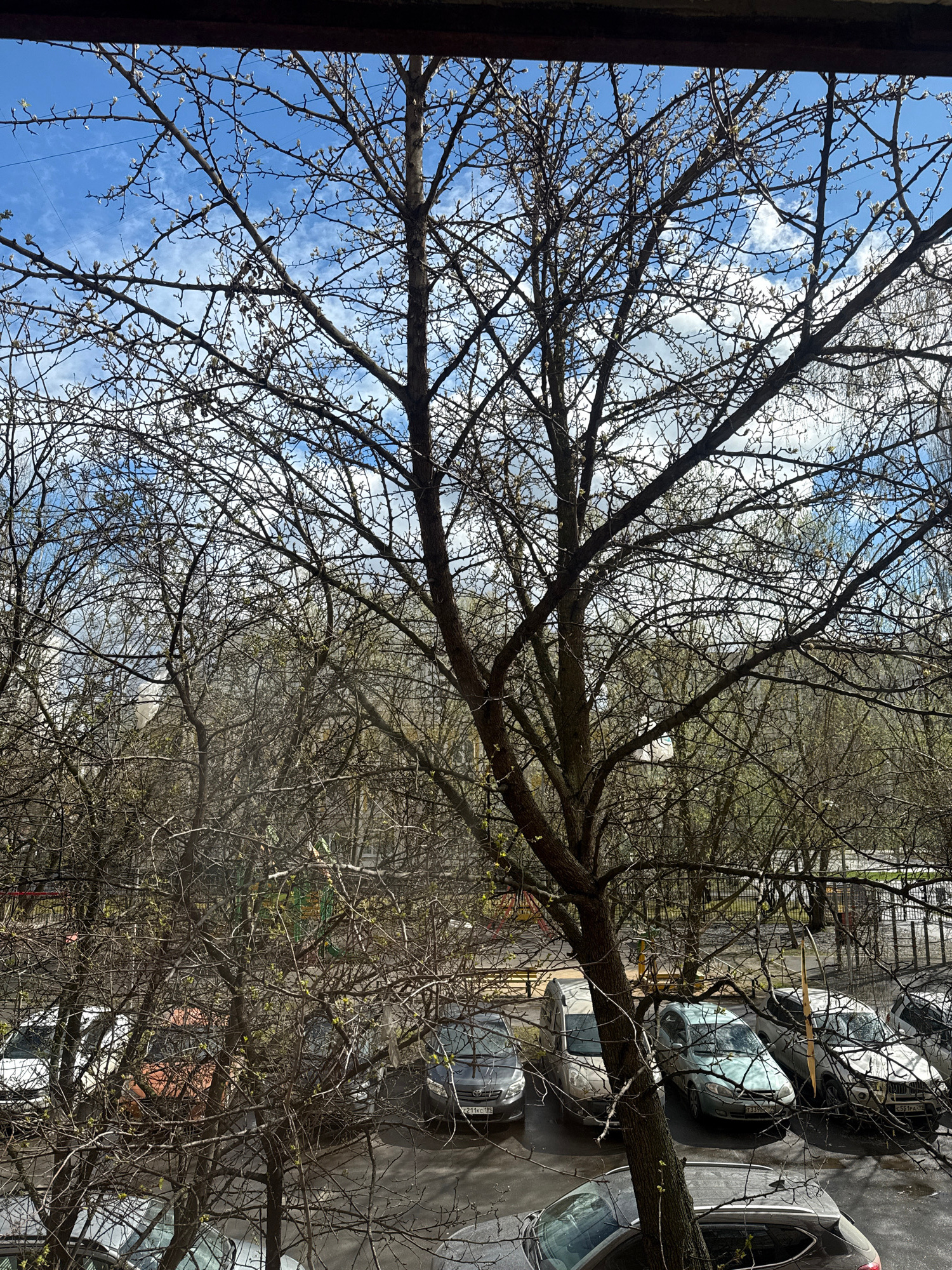 The image shows a view from a high vantage point, likely a window, in Reutov, Russia. In the foreground, bare tree branches with nascent buds fill much of the frame, set against a partly cloudy blue s…read more