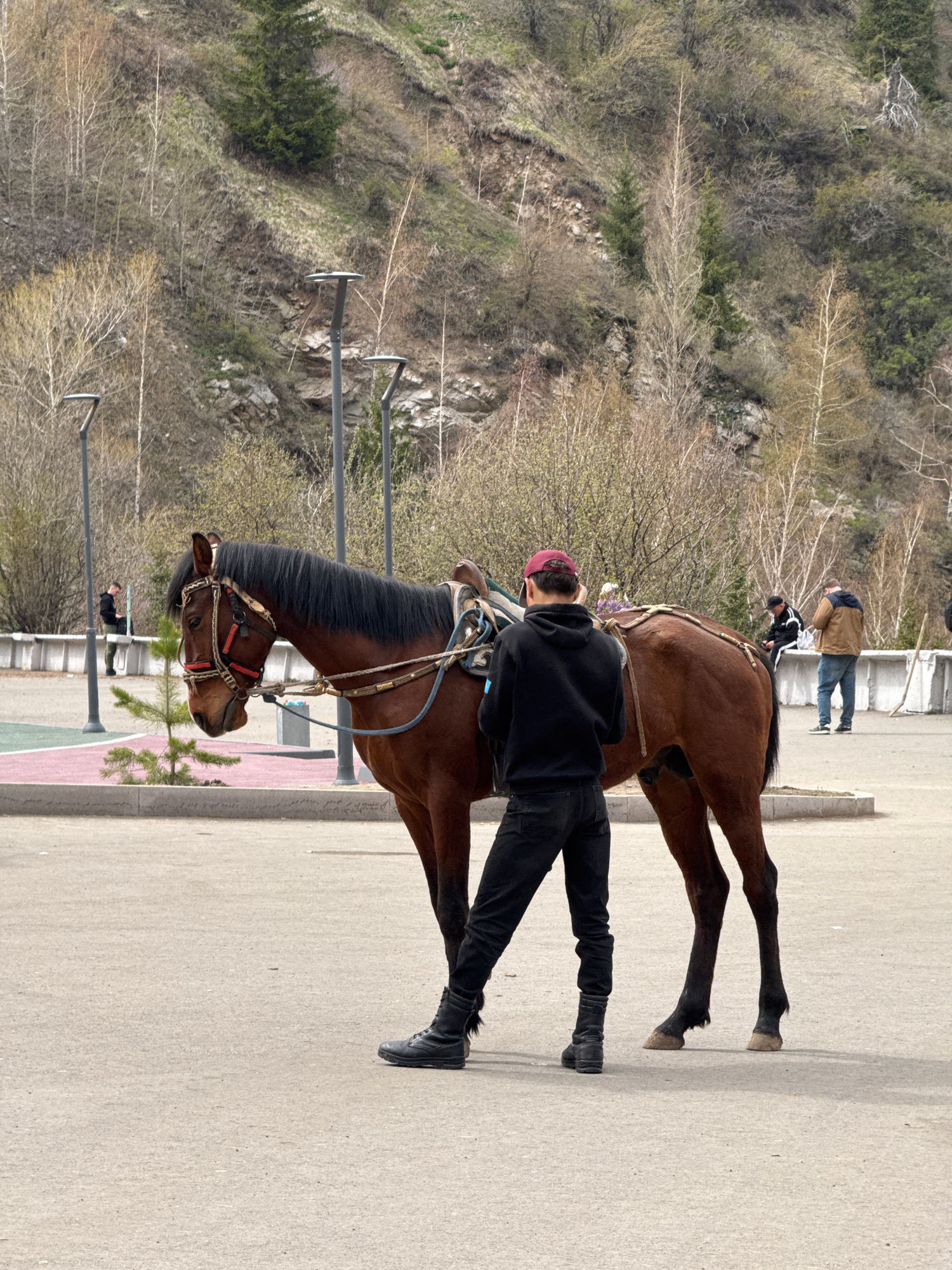 This media file captures a scene featuring a person and a horse on a paved surface, set against a backdrop of a wooded hillside. In the foreground, a brown horse, equipped with a saddle and an ornate…read more