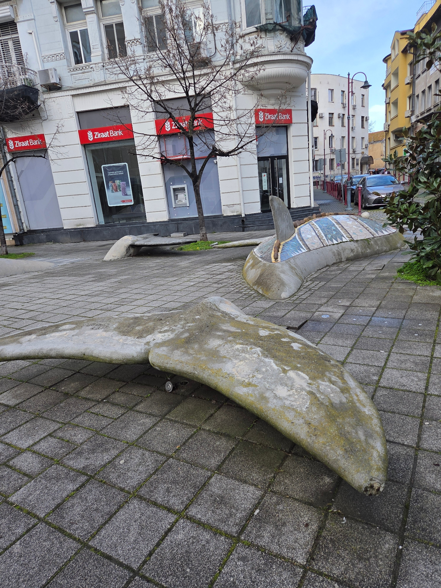 The image presents an urban street scene in Burgas, Bulgaria, characterized by public art installations and architectural elements. In the immediate foreground, a weathered, elongated concrete sculptu…read more