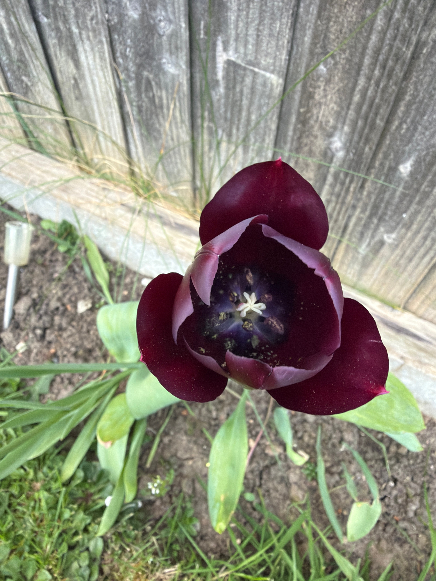A high-angle, eye-level shot captures a single, fully-bloomed dark maroon tulip. The tulip is positioned near a weathered, gray wooden fence on the left. The flower's interior reveals a pale white, st…read more