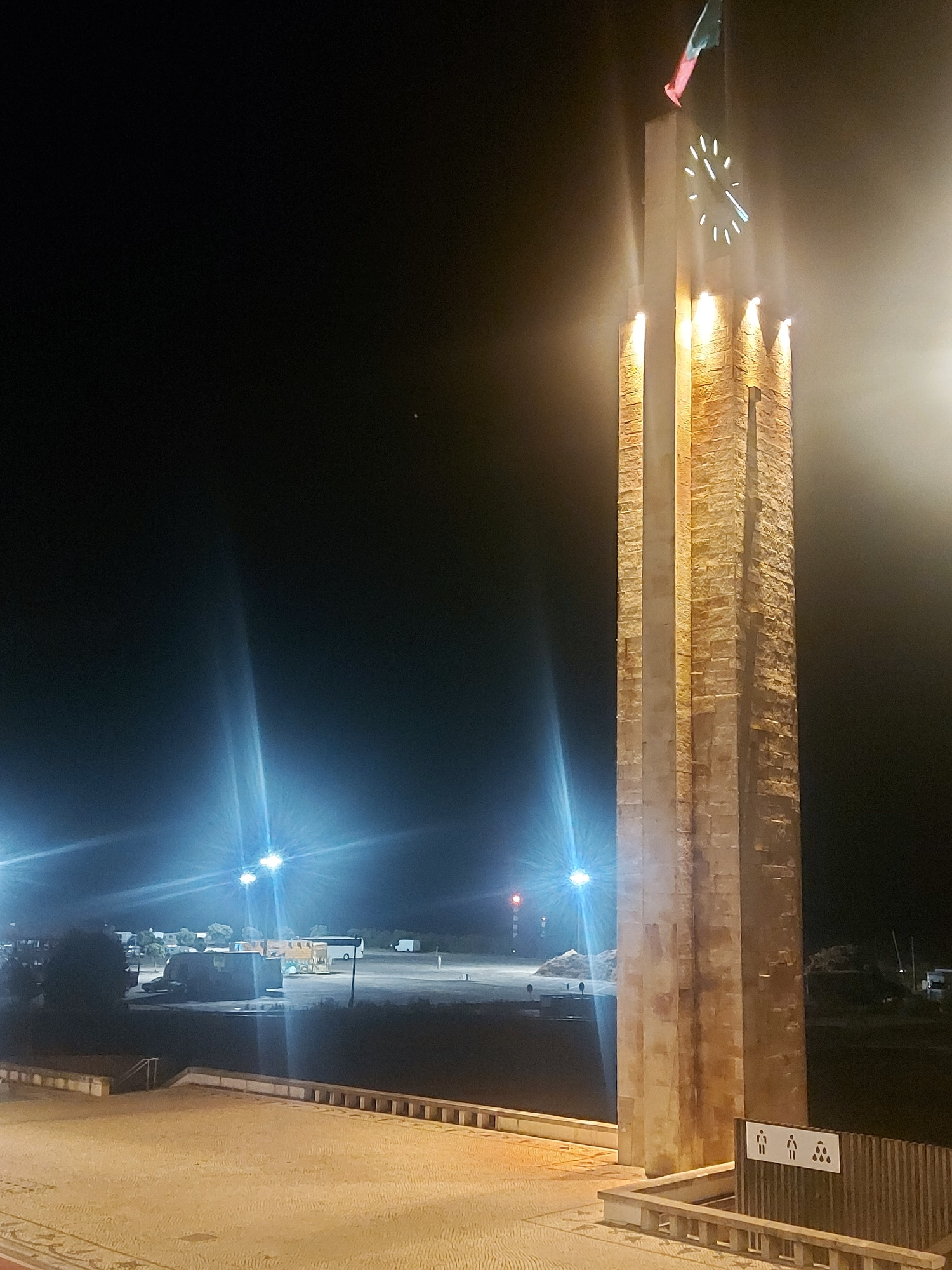 The image depicts the Claridade Clock Tower in Figueira da Foz, Portugal, at night. The tower is illuminated with lights, showcasing its stacked rectangular design. A clock face is visible near the to…read more