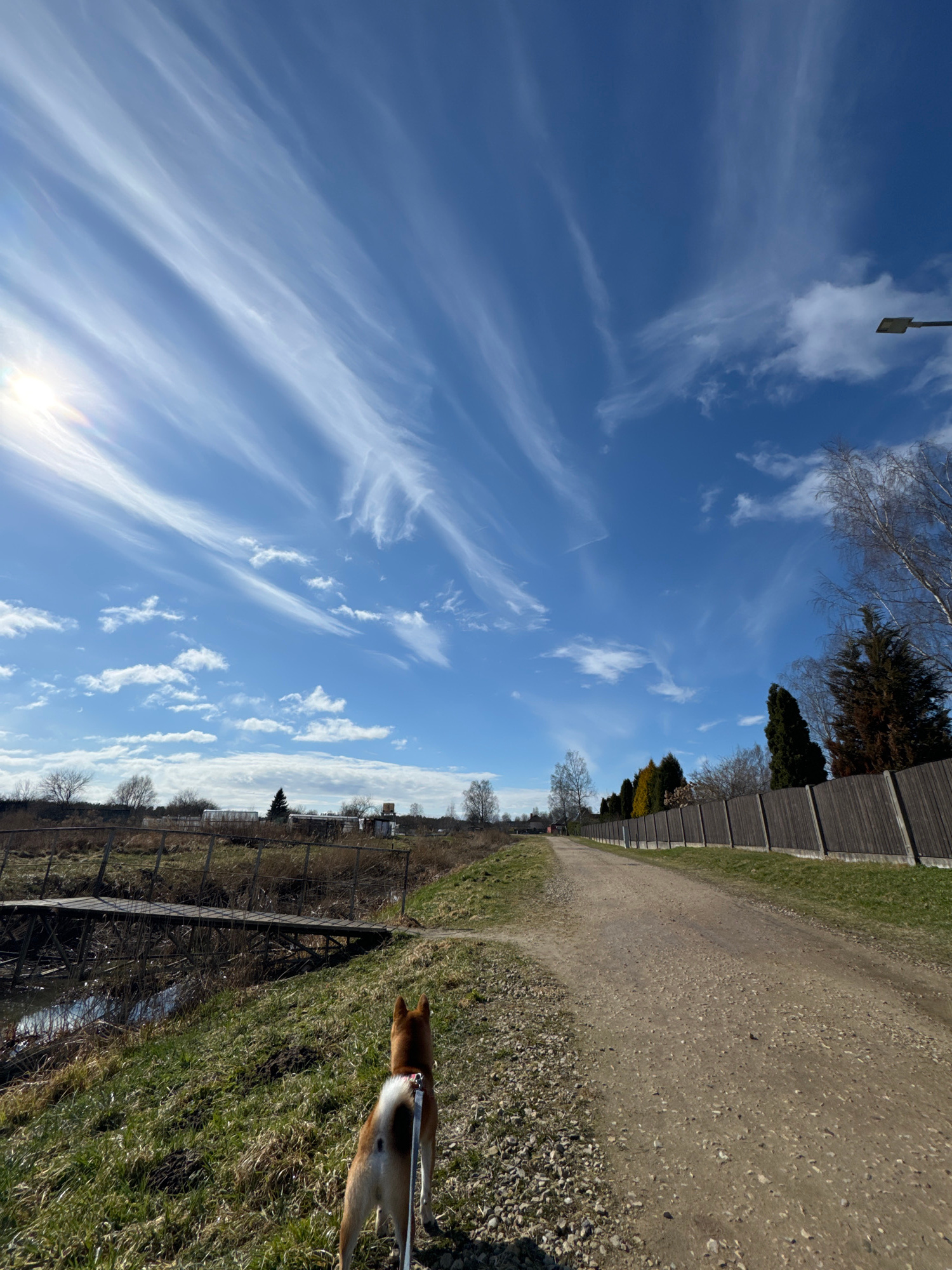 The image captures a dog walk in Carnikava, Latvia. A Shiba Inu, its back end visible in the lower right, is leashed on a grassy verge beside a path. The path, a dirt track, runs parallel to a tall wo…read more