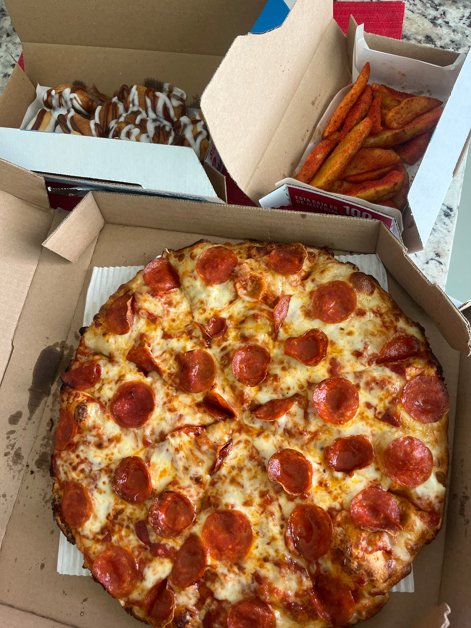 The image shows a partially opened pizza box containing a pepperoni pizza, alongside two other partially opened boxes. One contains potato wedges, and the other appears to contain dessert items with a…read more