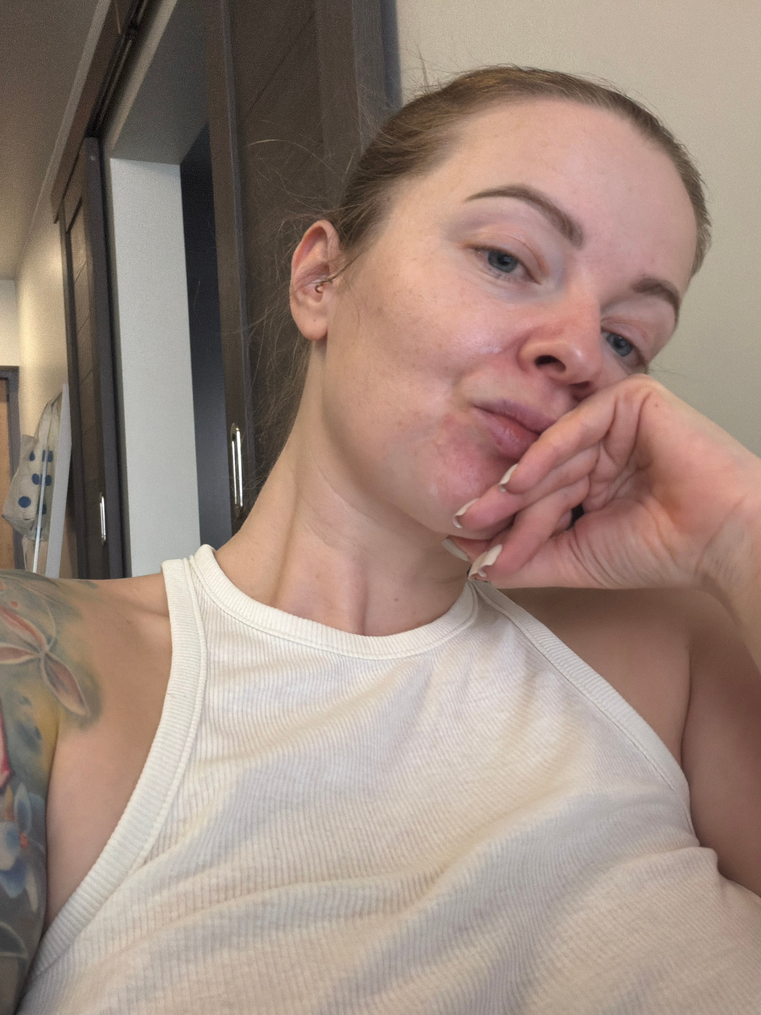 A woman is posing for a selfie. She is wearing a white tank top and has a tattoo on her upper arm. She is holding her hand to her face. The background appears to be an interior space with a cabinet vi…read more