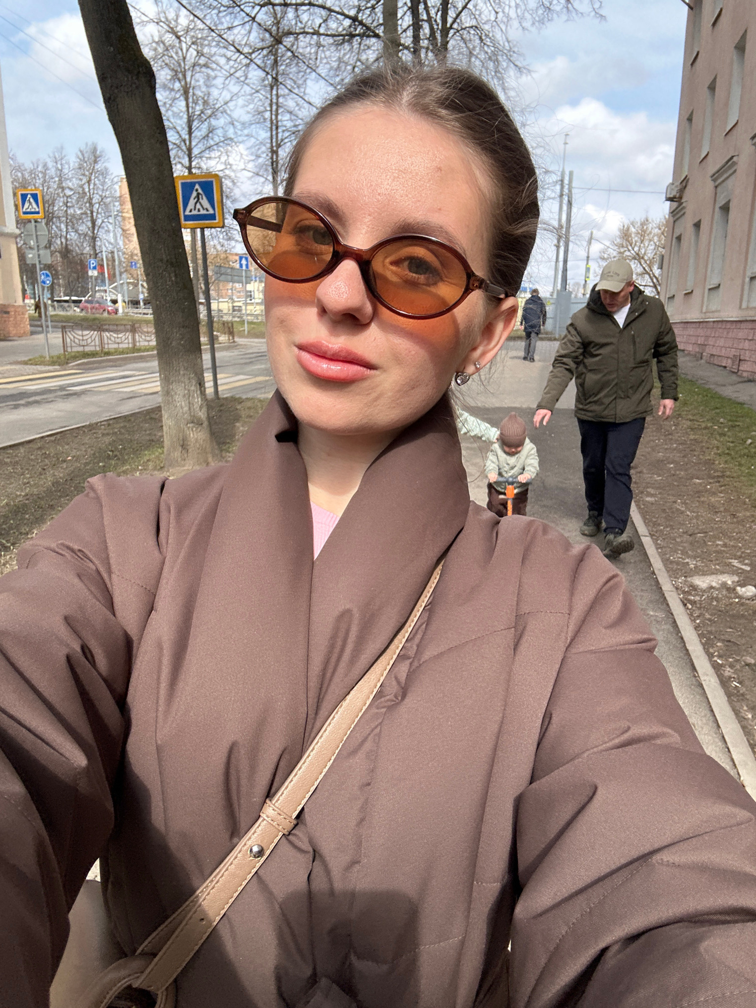 The image depicts a selfie taken outdoors, likely in Klin, Russia, judging by the Cyrillic characters on the road signs. The main subject is a fair-skinned person with light brown hair pulled back, we…read more