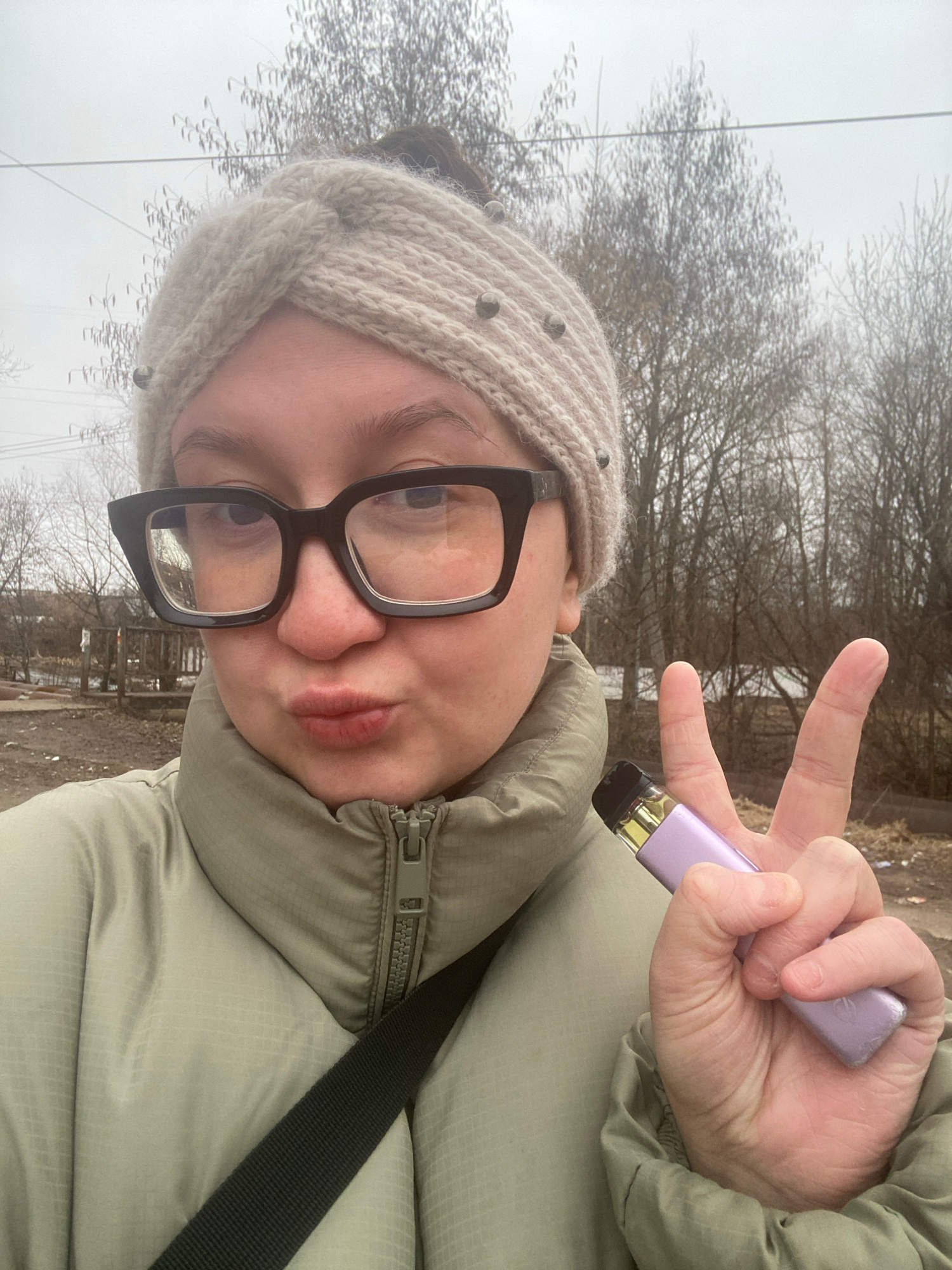A person is holding a purple disposable vaping device while making a peace sign with their fingers. They are wearing a light green puffer jacket, a light-colored knit headband with studs, and black-fr…read more