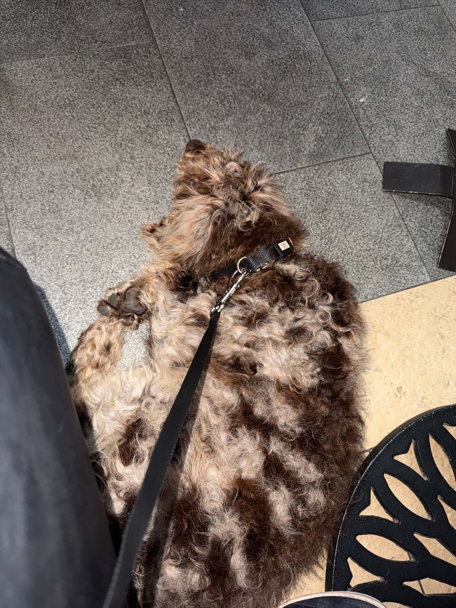 A medium-sized, brown and white curly-haired dog lies on a tiled floor indoors in Puebla, Mexico. The dog is on a black leash. A black metal table base is partially visible in the top center of the fr…read more