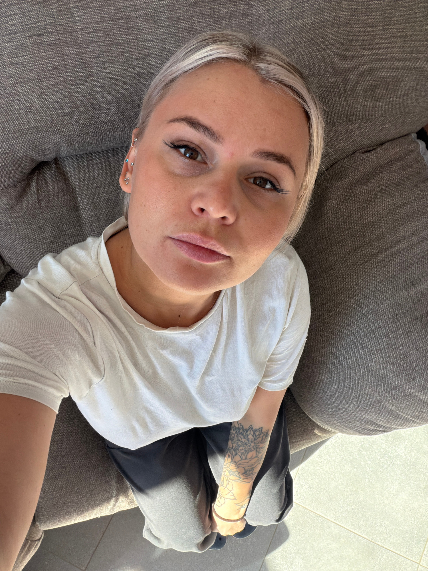 A young woman with short, light blonde hair is lying on a gray sofa. She is wearing a white t-shirt and dark-colored pants. Her right arm is visible, showing a floral tattoo. She is looking directly a…read more