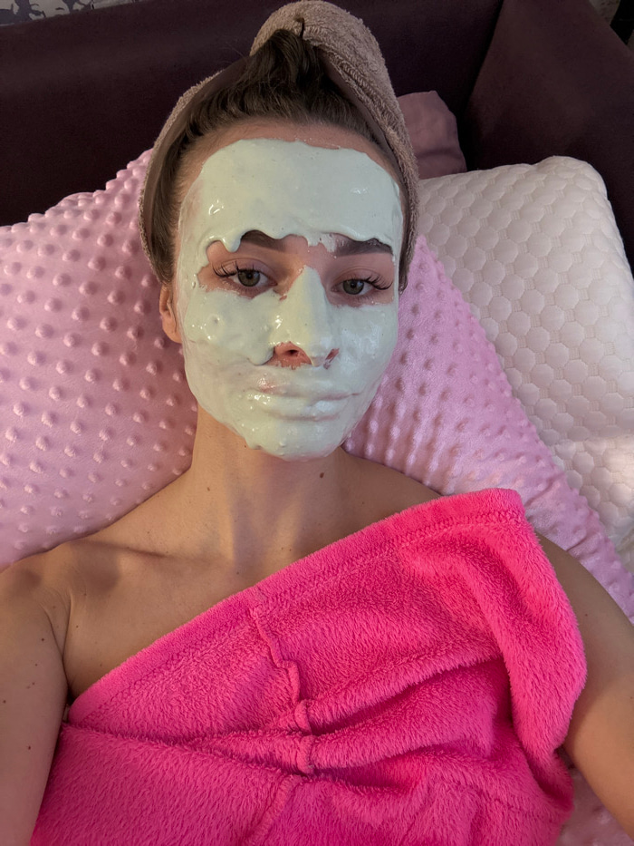 The image displays a female individual lying supine in an indoor setting. Her face is covered with a light green, viscous facial mask, leaving her eyes, eyebrows, and the area around her mouth exposed…read more