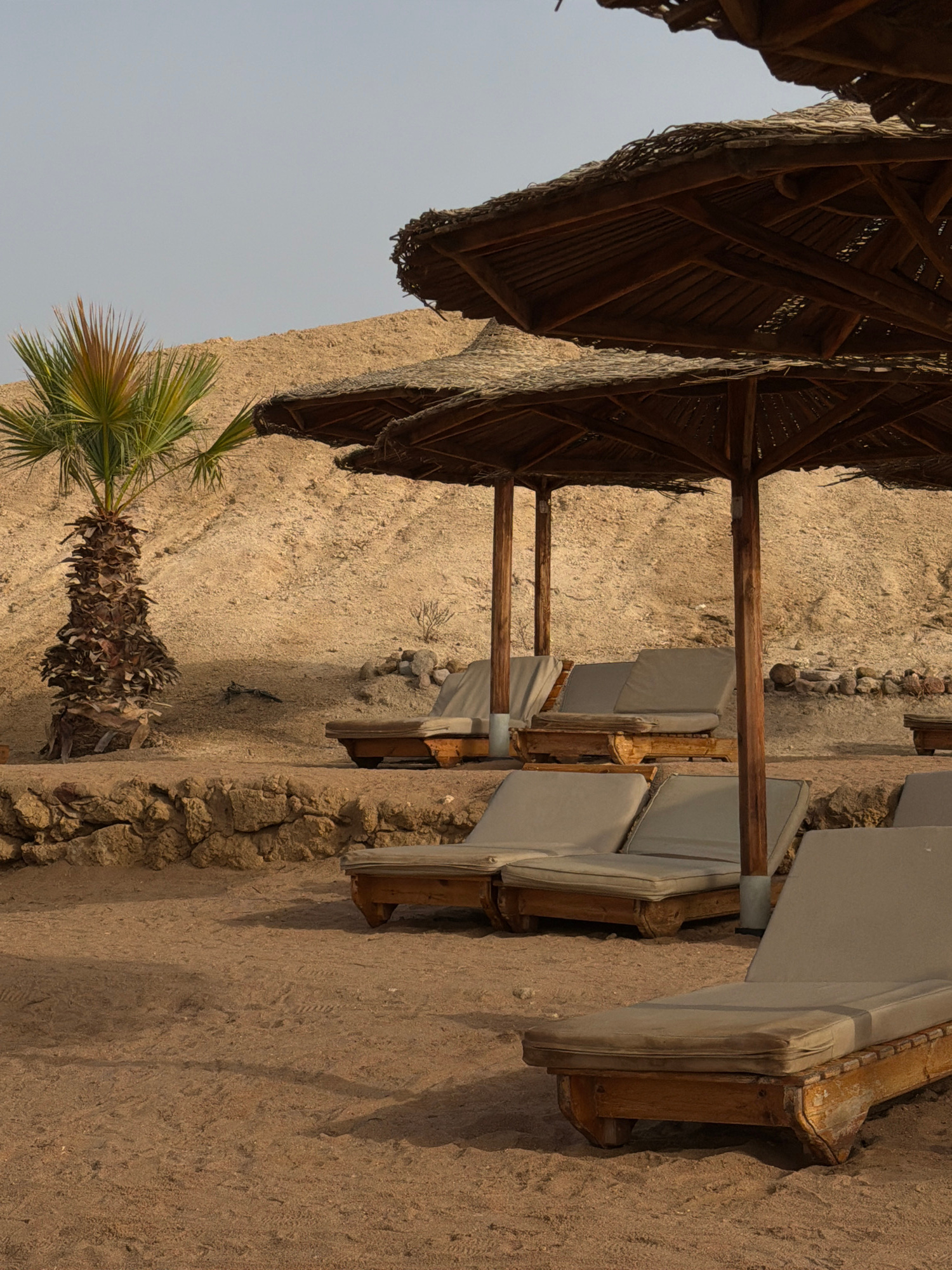 The image depicts a beach scene, likely in Sharm El Sheikh, Egypt, given the desert environment and tropical vegetation. A row of beach loungers with neutral-colored cushions are positioned near a san…read more