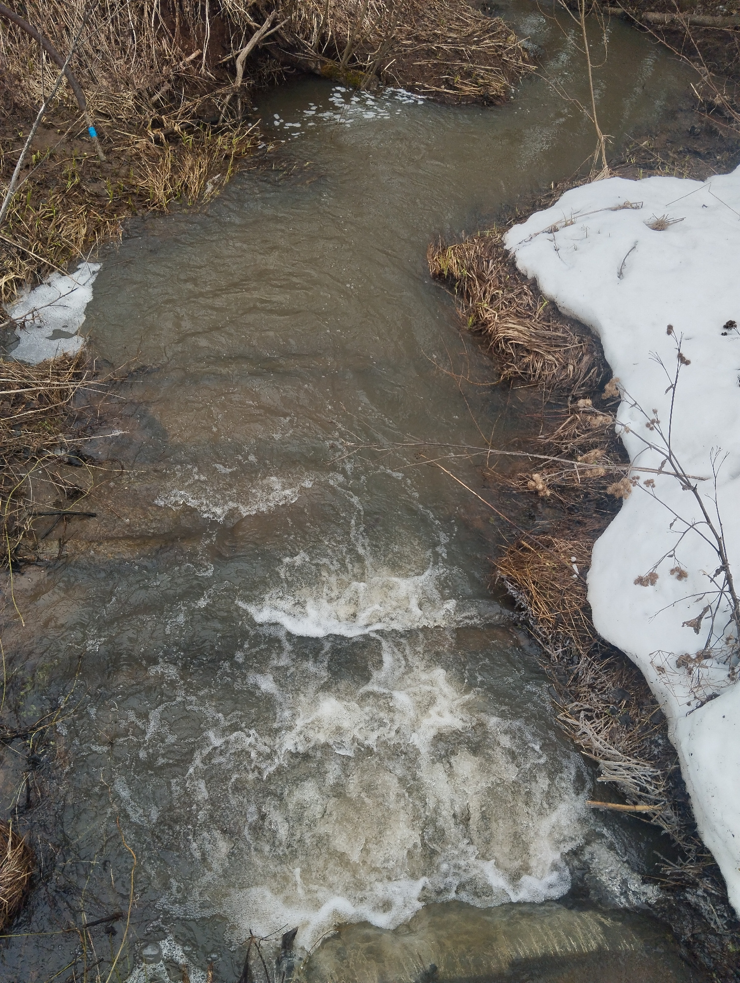 A stream flows through a landscape with melting snow, partially covered with dry grass and bare branches. The water is turbulent, with foamy white patches indicating movement and aeration. Patches of…read more