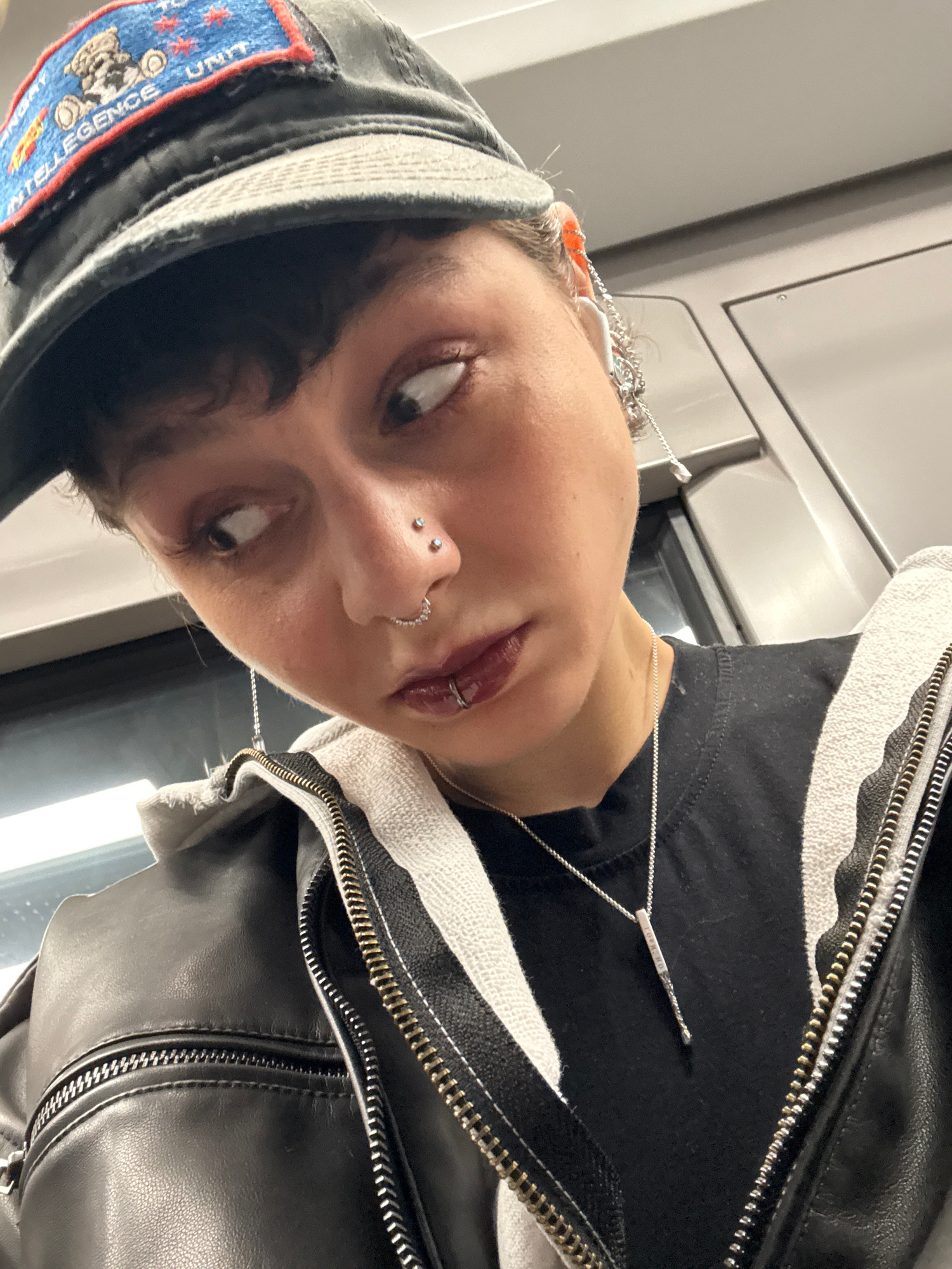 A close-up, slightly angled selfie of a person with dark hair, light skin, and several facial piercings (nostril, septum, and labret). The person wears a dark baseball cap with a patch (likely militar…read more