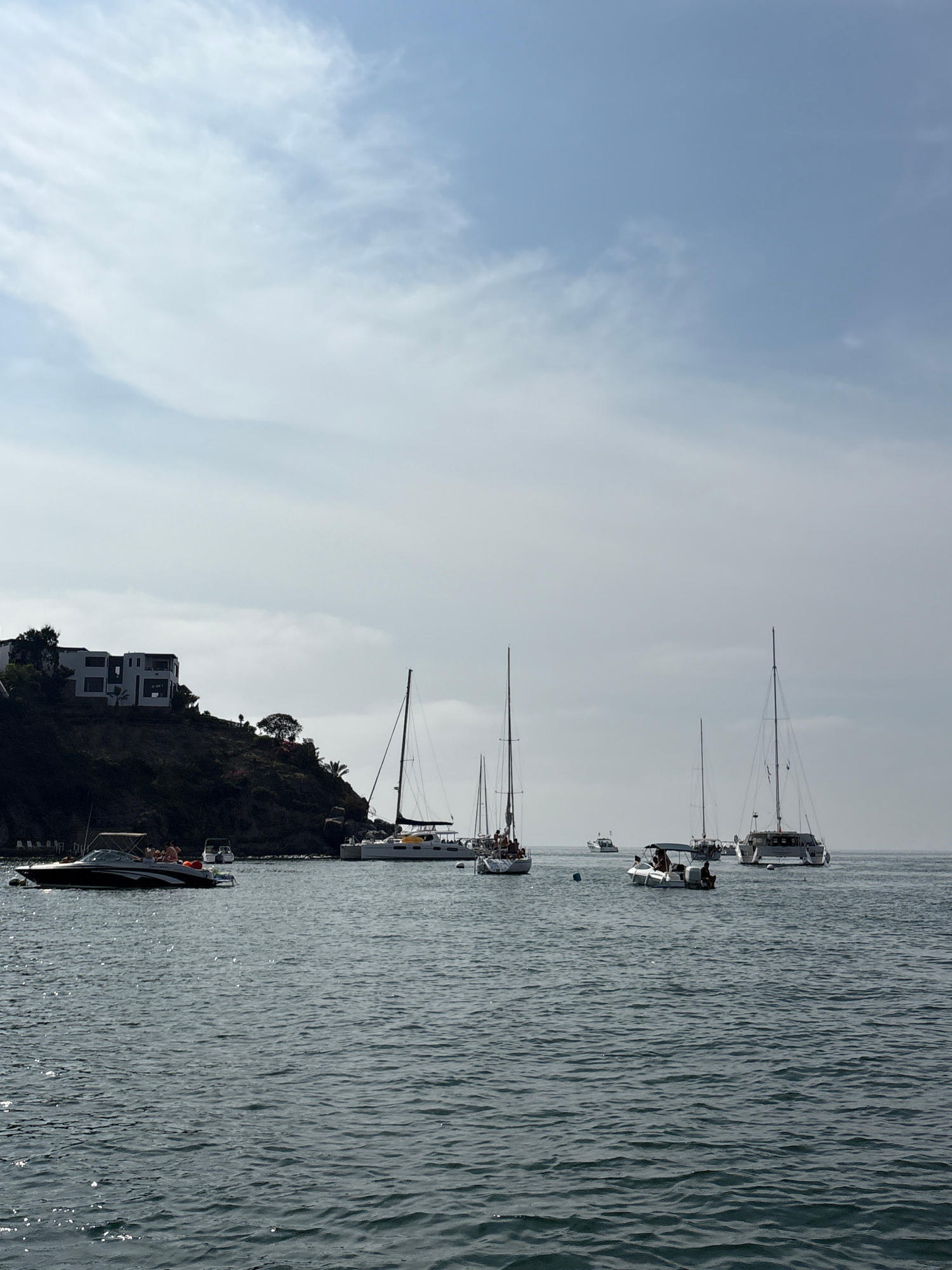 The image captures a coastal scene in Ancón, Peru. Several sailboats and yachts are anchored in calm, gray-toned water. In the mid-ground, a rocky promontory rises from the water. At its base, there i…read more