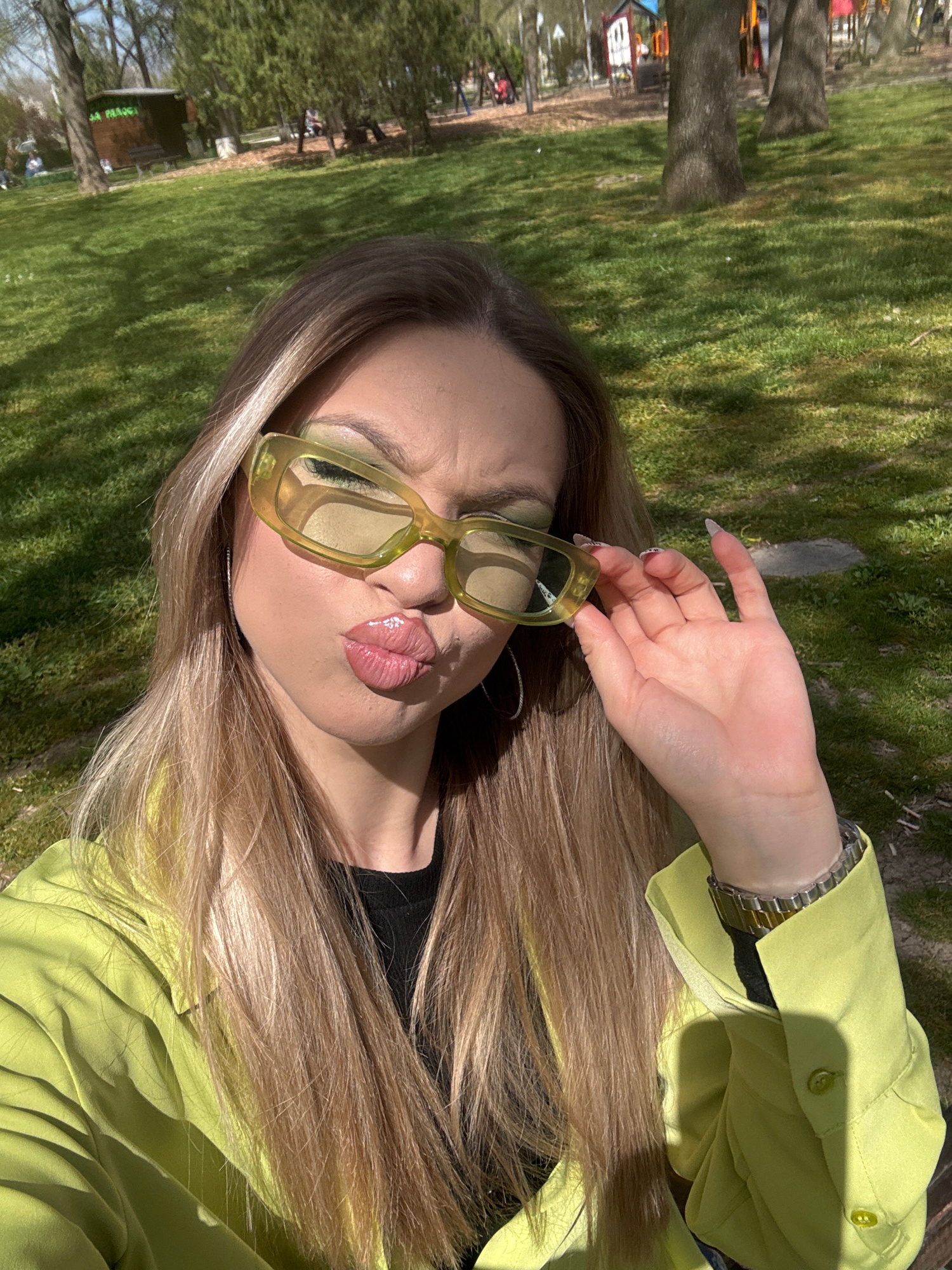 A woman is captured in a close-up, angled outdoor shot, posing under bright sunlight in what appears to be a park in Plovdiv, Bulgaria. She has long, light brown hair that cascades over her shoulders…read more