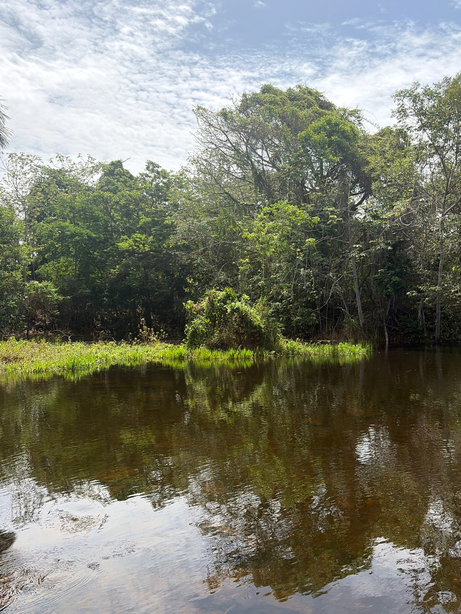 The image displays a serene natural landscape featuring a body of water bordered by dense, lush green trees under a bright sky. The scene is dominated by a vibrant array of green foliage from numerous…read more