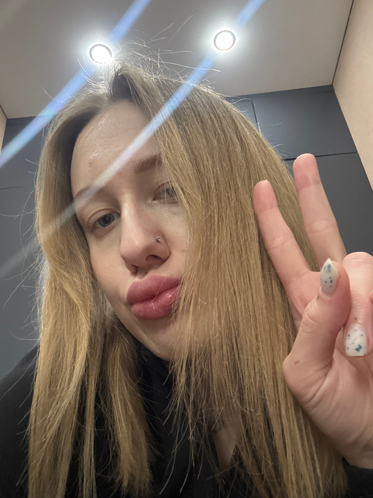 A rotated close-up selfie shows a young woman with long, blonde hair partially covering her face, making a peace sign with her right hand. She has a piercing on the left side of her nose. The backgrou…read more